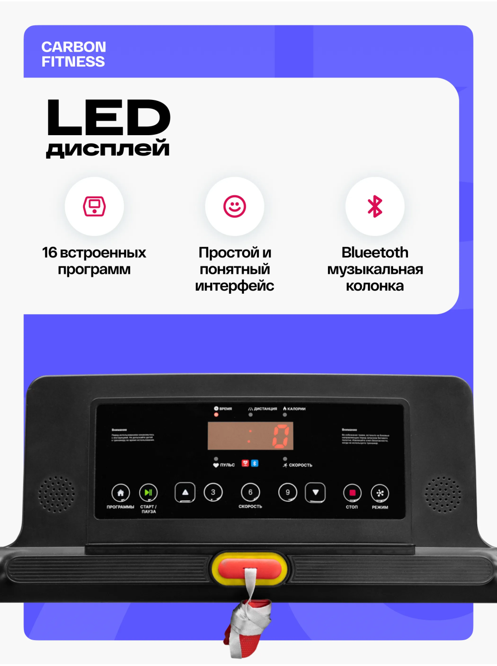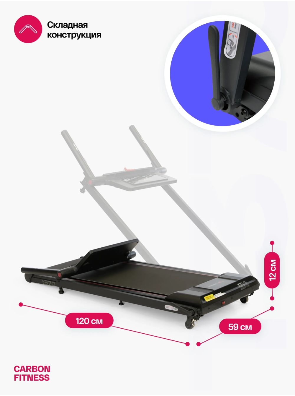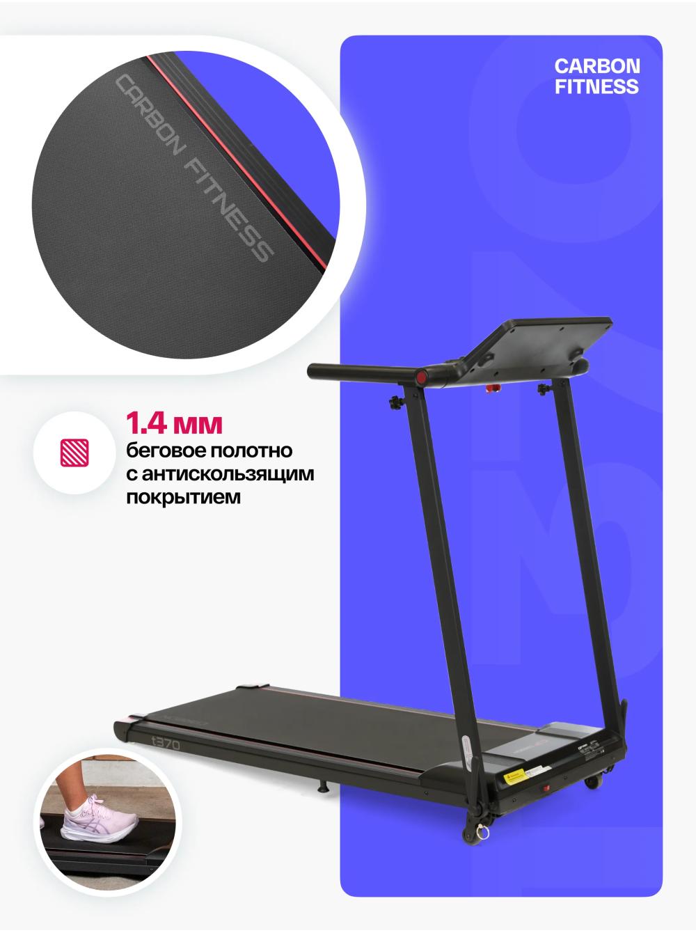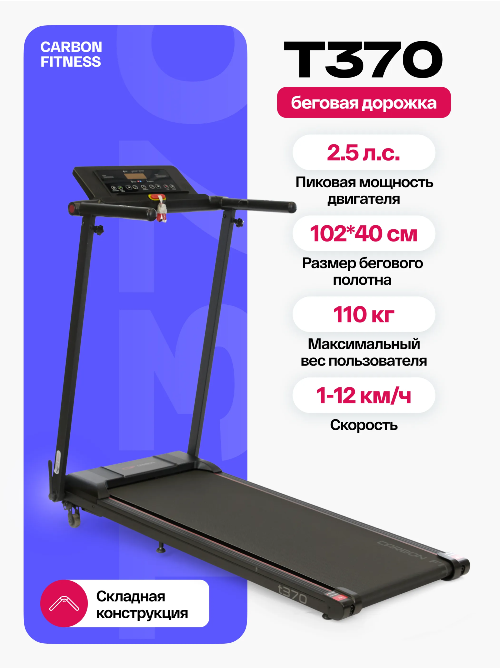 Беговая дорожка домашняя CARBON FITNESS T370 0 отзывов 26990р. Производитель: CARBON Наличие: Есть в наличии Модель: T370 Одежда Обувь Как выбрать одежду своего размера? Купить Купить в один клик Скидки постоянным клиентам! Гарантия качества всех товаров магазина! Описание Отзывов (0) Особенности:многофункциональная консоль с подставкой для телефона сенсорные датчики пульса удобная рукоять для складывания консоли длина бегового полотна см:102*40 см компенсаторы неровностей пола c эластомером рукоять для складывания дорожки механическая регулировка угла наклона 2 резиновых эластометра для еще большей амортизации БрендCarbon FitnessАртикулT370Назначение домашнееТип тренажера электрическая беговая дорожкаДвигатель1.5 л.с. DC Leeson Electric CorporationПиковая мощность двигателя, л.с.2.5 DCСкорость, км/ч1-12Максимальный вес пользователя 110Беговое полотно1.4 мм, антискользящееДлина бегового полотна, см102Ширина бегового полотна, см40Регулировка угла наклона ручнаяКоличество уровней наклона3Материал декиМДФ, парафинированнаяТолщина деки12 ммСистема амортизации2 плоских резиновых эластомера Natural™Измерение пульсаестьКонсоль LEDТип консоли LED дисплей с красной индикациейПоказания консоливремя, скорость, дистанция, калории, пульс, программыОбщее количество программ16Спецификация программручной режим, 12 встроенных, 3 целевые (время, дистанция, калории)Мультимедиаколонки BluetoothЯзык интерфейсаанглийскийСкладная конструкция ДаПодставка под планшет/смартфонДаТранспортировочные роликиДаКомпенсаторы неровностей полаДаДополнительные функциисенсорные датчики на поручняхДлина в рабочем состоянии, см120Ширина в рабочем состоянии, см59Высота в рабочем состоянии, см110Вес нетто, кг25Вес брутто, кг30Подключение к сети220 ВПроизводительFitathlon Group (подразделение в Германии)Страна изготовленияКНР CARBON FITNESS T370 — это домашняя беговая дорожка, которая предлагает весь необходимый функционал для комфортных и эффективных тренировок в домашних условиях. Модель оснащена мотором мощностью 1,5 л.с. с пиковым значением 2,5 л.с., что позволяет развивать скорость до 12 км/ч, делая тренировки подходящими как для начинающих, так и для продвинутых пользователей. LED-дисплей консоли с понятным интерфейсом на английском языке отображает основные параметры тренировки: время, скорость, дистанцию, количество потраченных калорий и пульс. Встроенные сенсорные датчики позволяют отслеживать пульс прямо во время занятий. Для удобства пользователя дорожка оборудована Bluetooth-колонкой для прослушивания музыки с телефона и подставкой для смартфона или планшета. CARBON FITNESS T370 предлагает выбор из 16 программ: 12 предустановленных режимов и 3 целевые программы (время, дистанция, калории). Также доступен ручной режим, что дает пользователю возможность гибко управлять тренировками. Угол наклона дорожки регулируется механически, предлагая 3 варианта наклона добавляя разнообразие в занятия. Благодаря складной конструкции, небольшим габаритам и транспортировочным роликам, дорожка легко хранится и перемещается. Амортизационная система из двух резиновых эластометров снижает нагрузку на суставы, делая тренировки безопасными. Максимальный вес пользователя составляет 110 кг, что подтверждает надежность и прочность модели. CARBON FITNESS T370 станет надежным помощником для поддержания физической формы и ведения здорового образа ж