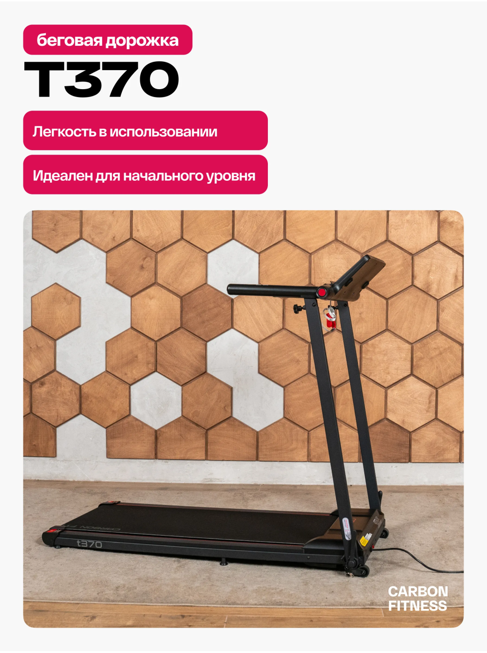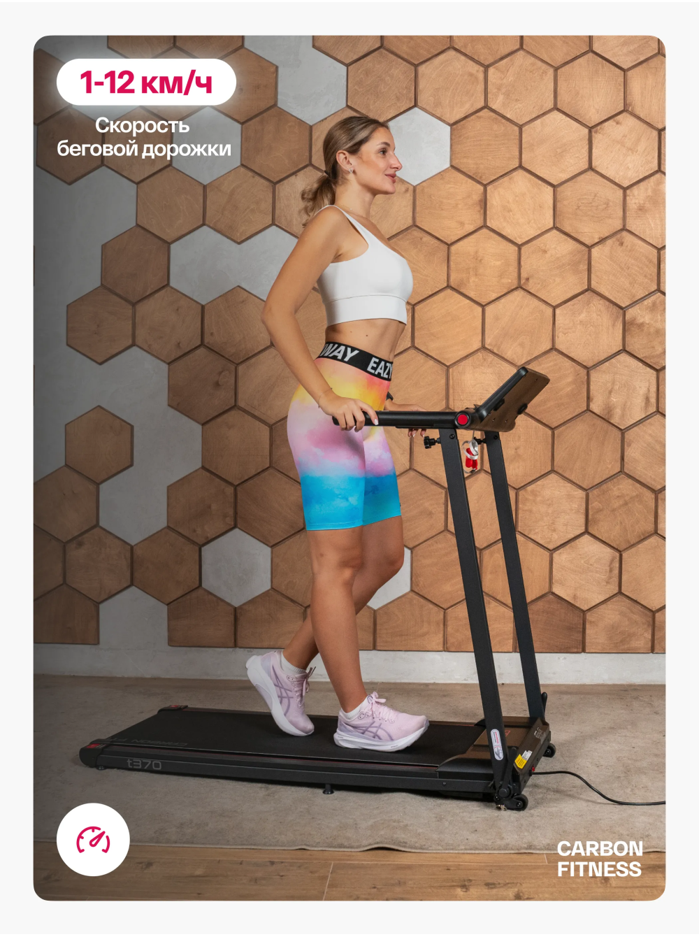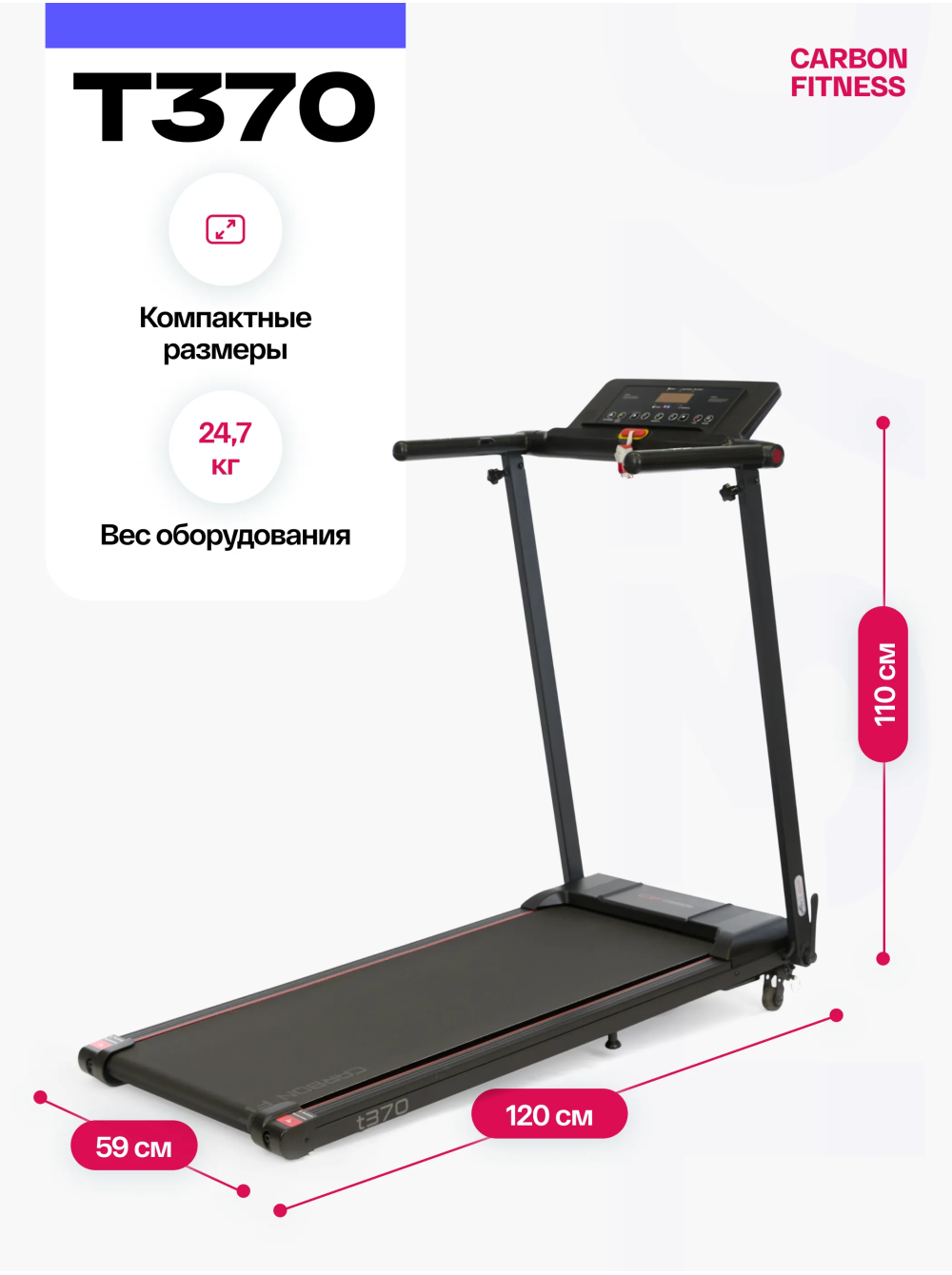 Беговая дорожка домашняя CARBON FITNESS T370 0 отзывов 26990р. Производитель: CARBON Наличие: Есть в наличии Модель: T370 Одежда Обувь Как выбрать одежду своего размера? Купить Купить в один клик Скидки постоянным клиентам! Гарантия качества всех товаров магазина! Описание Отзывов (0) Особенности:многофункциональная консоль с подставкой для телефона сенсорные датчики пульса удобная рукоять для складывания консоли длина бегового полотна см:102*40 см компенсаторы неровностей пола c эластомером рукоять для складывания дорожки механическая регулировка угла наклона 2 резиновых эластометра для еще большей амортизации БрендCarbon FitnessАртикулT370Назначение домашнееТип тренажера электрическая беговая дорожкаДвигатель1.5 л.с. DC Leeson Electric CorporationПиковая мощность двигателя, л.с.2.5 DCСкорость, км/ч1-12Максимальный вес пользователя 110Беговое полотно1.4 мм, антискользящееДлина бегового полотна, см102Ширина бегового полотна, см40Регулировка угла наклона ручнаяКоличество уровней наклона3Материал декиМДФ, парафинированнаяТолщина деки12 ммСистема амортизации2 плоских резиновых эластомера Natural™Измерение пульсаестьКонсоль LEDТип консоли LED дисплей с красной индикациейПоказания консоливремя, скорость, дистанция, калории, пульс, программыОбщее количество программ16Спецификация программручной режим, 12 встроенных, 3 целевые (время, дистанция, калории)Мультимедиаколонки BluetoothЯзык интерфейсаанглийскийСкладная конструкция ДаПодставка под планшет/смартфонДаТранспортировочные роликиДаКомпенсаторы неровностей полаДаДополнительные функциисенсорные датчики на поручняхДлина в рабочем состоянии, см120Ширина в рабочем состоянии, см59Высота в рабочем состоянии, см110Вес нетто, кг25Вес брутто, кг30Подключение к сети220 ВПроизводительFitathlon Group (подразделение в Германии)Страна изготовленияКНР CARBON FITNESS T370 — это домашняя беговая дорожка, которая предлагает весь необходимый функционал для комфортных и эффективных тренировок в домашних условиях. Модель оснащена мотором мощностью 1,5 л.с. с пиковым значением 2,5 л.с., что позволяет развивать скорость до 12 км/ч, делая тренировки подходящими как для начинающих, так и для продвинутых пользователей. LED-дисплей консоли с понятным интерфейсом на английском языке отображает основные параметры тренировки: время, скорость, дистанцию, количество потраченных калорий и пульс. Встроенные сенсорные датчики позволяют отслеживать пульс прямо во время занятий. Для удобства пользователя дорожка оборудована Bluetooth-колонкой для прослушивания музыки с телефона и подставкой для смартфона или планшета. CARBON FITNESS T370 предлагает выбор из 16 программ: 12 предустановленных режимов и 3 целевые программы (время, дистанция, калории). Также доступен ручной режим, что дает пользователю возможность гибко управлять тренировками. Угол наклона дорожки регулируется механически, предлагая 3 варианта наклона добавляя разнообразие в занятия. Благодаря складной конструкции, небольшим габаритам и транспортировочным роликам, дорожка легко хранится и перемещается. Амортизационная система из двух резиновых эластометров снижает нагрузку на суставы, делая тренировки безопасными. Максимальный вес пользователя составляет 110 кг, что подтверждает надежность и прочность модели. CARBON FITNESS T370 станет надежным помощником для поддержания физической формы и ведения здорового образа ж