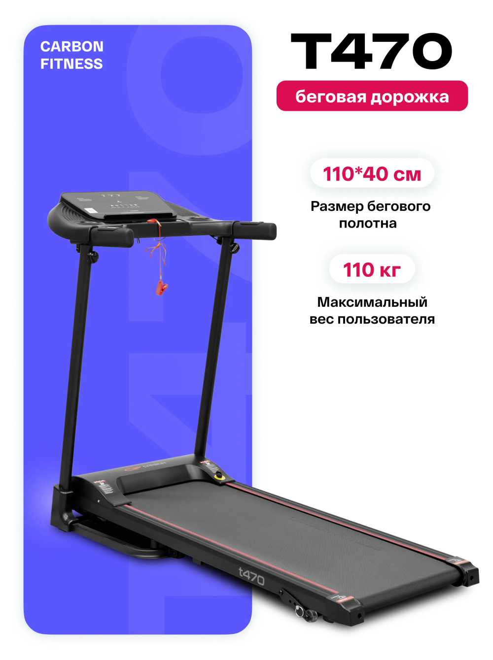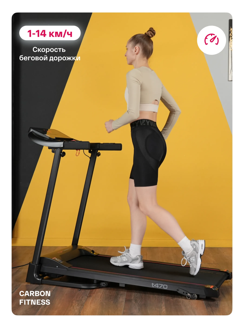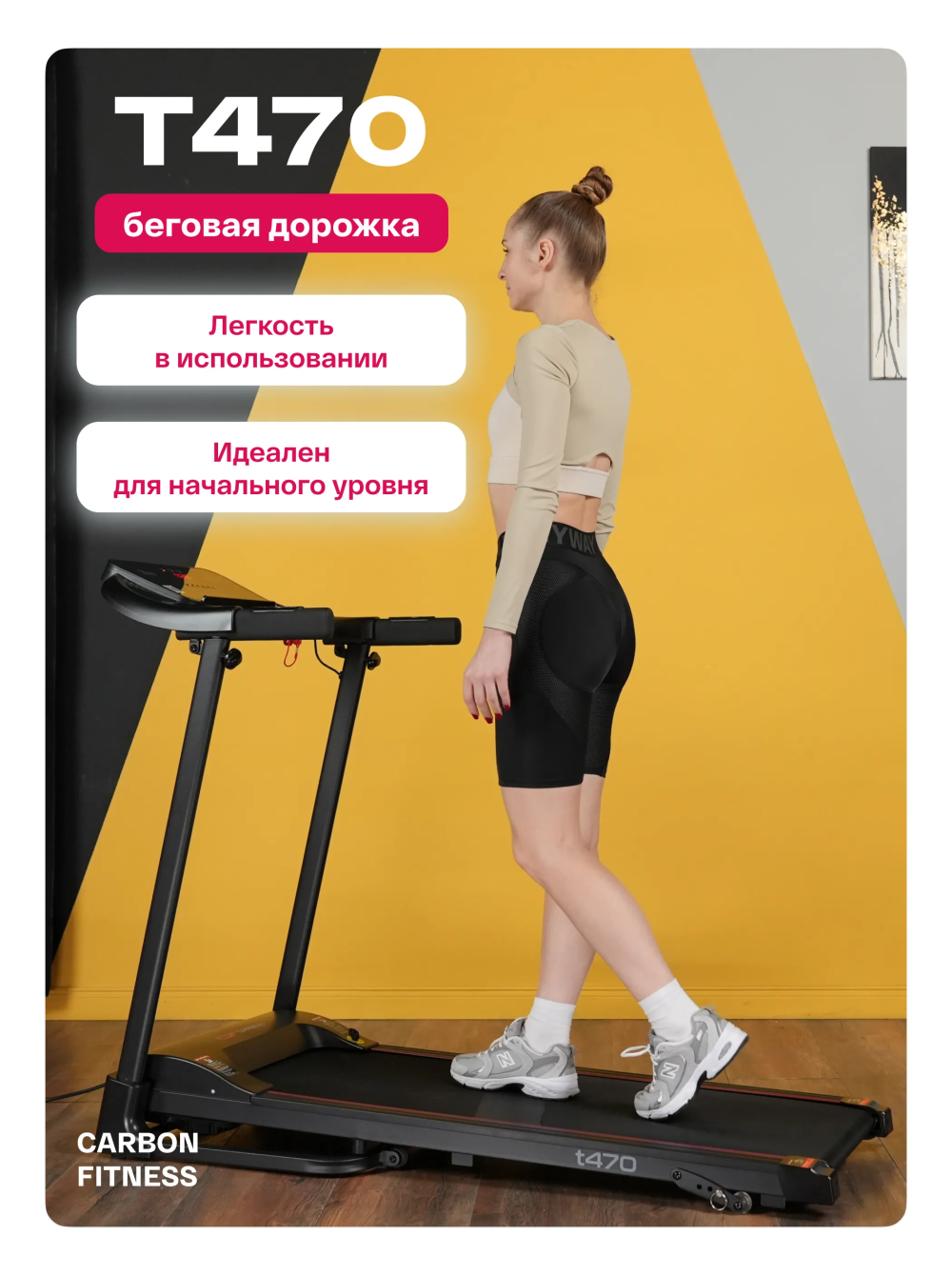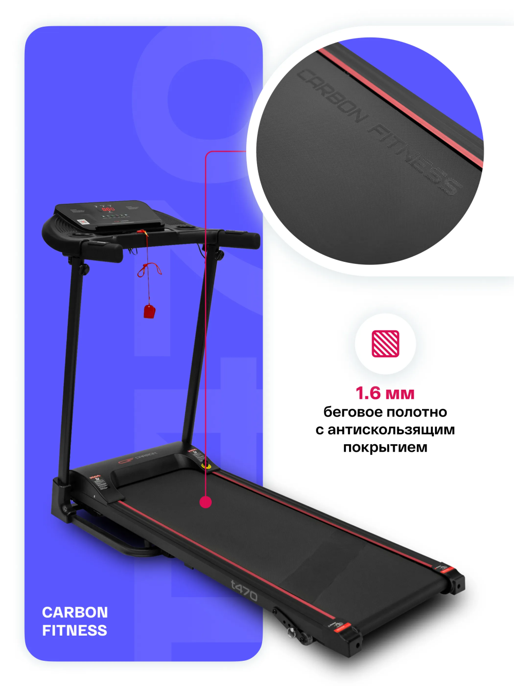 Беговая дорожка домашняя CARBON FITNESS T470 0 отзывов 33990р. Производитель: CARBON Наличие: Есть в наличии Модель: T470 Одежда Обувь Как выбрать одежду своего размера? Купить Купить в один клик Скидки постоянным клиентам! Гарантия качества всех товаров магазина! Описание Отзывов (0) Особенности:Механическая регулировка наклона (3 уровня)РАЗМЕРЫ БЕГОВОГО ПОЛОТНА 110Х40 СМУдобная складная конструкцияСистема амортизацииСпециальный отсек для смазки бегового полотнаСистема складывания soft DropТолщина бегового полотна 1,6 ммШирокие Боковые направляющие для старта и окончания тренировкиЛёгкий способ складывания консольной частиКомфортное измерение пульса во время тренировкиТранспортировочные роликиПодставка под смартфонПодставка под бутылку с водойКлюч безопасности БрендCarbon FitnessАртикулT470Назначение домашнееТип тренажера электрическая беговая дорожкаДвигатель1.75 л.с. DC Leeson Electric Corporation (бесщеточный)Пиковая мощность двигателя, л.с.3.0 DCСкорость, км/ч1-14Максимальный вес пользователя 110Беговое полотно1.6 мм, антискользящееДлина бегового полотна, см112Ширина бегового полотна, см40Регулировка угла наклона ручнаяКоличество уровней наклона3Материал декиМДФ, парафинированнаяТолщина деки12 ммСистема амортизации2 плоских силиконовых эластомеров Natural S™, 4 плоских эластомера Natural™, 2 эластомера v-Absorbers™Измерение пульсаестьКонсоль LEDТип консоли LED дисплей с красной индикациейПоказания консоливремя, скорость, дистанция, калории, жироанализатор, программаОбщее количество программ17Спецификация программбыстрый старт, 12 предустановленных, 3 целевые (время, дистанция, калории), жироанализаторМультимедиаколонки BluetoothИнтеграционные технологииBluetooth для работы с тренировочным мобильным приложением (Spax™, Kinomap™)Язык интерфейсарусский, английскийСкладная конструкция ДаПодставка под планшет/смартфонДаТранспортировочные роликиДаКомпенсаторы неровностей полаДаДополнительные функциисенсорные датчики на поручнях, возможность подключения кардиодатчика Bluetooth через фитнес-приложенияДополнительные особенности тренажеракнопки управления на поручнях, ключ безопасности, система легкой смазки бегового полотна (автосмазка)Длина в рабочем состоянии, см145.3Ширина в рабочем состоянии, см61.7Высота в рабочем состоянии, см111Вес нетто, кг32Вес брутто, кг37Подключение к сети220 ВПроизводительFitathlon Group (подразделение в Германии)Страна изготовленияКНР Беговая дорожка CARBON FITNESS T470 - это высококачественное оборудование, созданное для эффективных и комфортных тренировок в домашних условиях. Сочетая в себе передовые технологии, продуманный дизайн и широкий функционал, эта модель станет надежным помощником на пути к достижению ваших фитнес-целей. CARBON FITNESS T470 оснащена бесщеточным двигателем мощностью 1,75 л.с. с пиковым показателем 3 л.с., обеспечивая плавный разгон скорости от 1 до 14 км/ч. Беговое полотно размером 110x40 см с толщиной 1,6 мм и парафинированной декой из МДФ толщиной 12 мм гарантирует комфорт и безопасность во время тренировок. Система амортизации с 2 плоскими силиконовыми эластомерами Natural S™, 4 плоскими эластомерами Natural™ и 2 эластомерами v-Absorbers™ смягчает нагрузку на суставы. Консоль дорожки оснащена тремя LED-дисплеями с красной индикацией, отображающими ключевые параметры тренировки: время, скорость, дистанцию, калории, жироанализатор. Интерфейс поддерживает русски