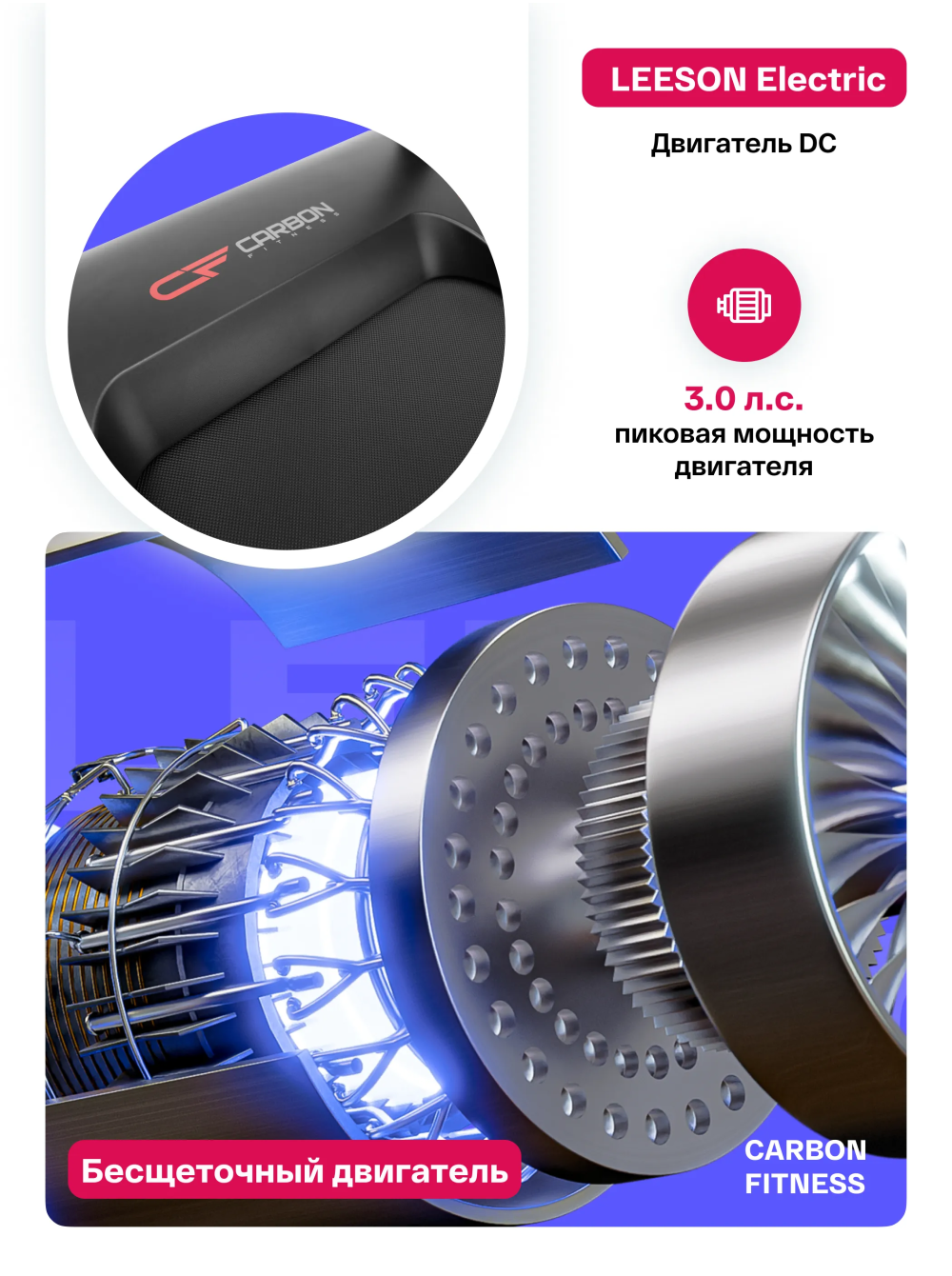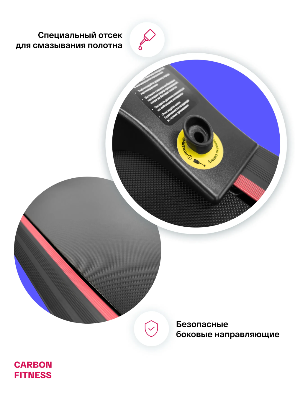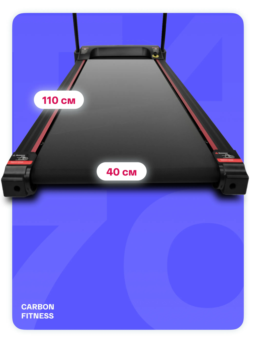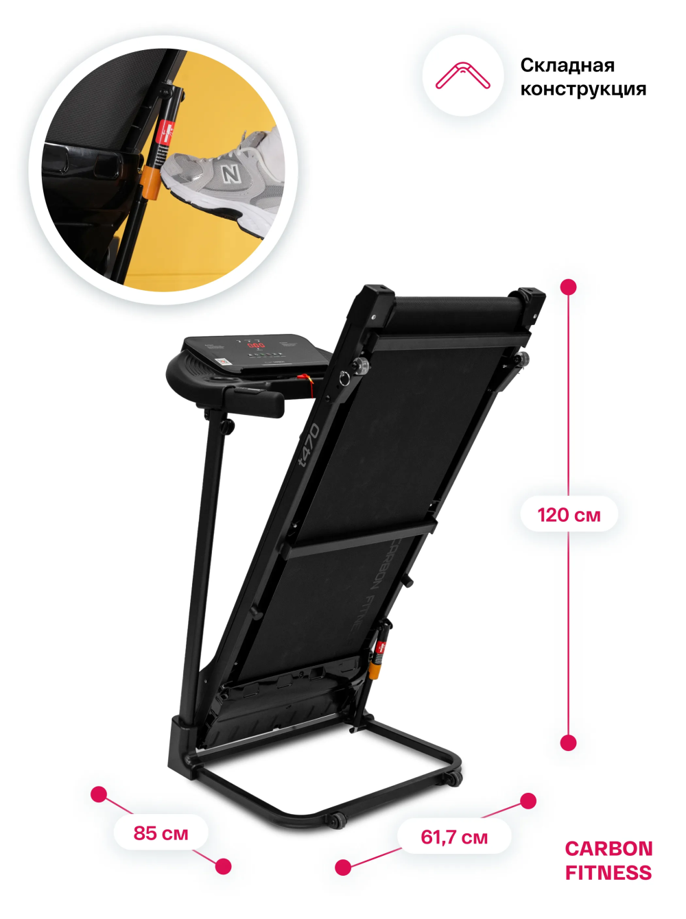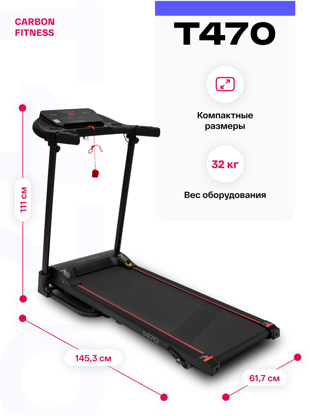 Беговая дорожка домашняя CARBON FITNESS T470 0 отзывов 33990р. Производитель: CARBON Наличие: Есть в наличии Модель: T470 Одежда Обувь Как выбрать одежду своего размера? Купить Купить в один клик Скидки постоянным клиентам! Гарантия качества всех товаров магазина! Описание Отзывов (0) Особенности:Механическая регулировка наклона (3 уровня)РАЗМЕРЫ БЕГОВОГО ПОЛОТНА 110Х40 СМУдобная складная конструкцияСистема амортизацииСпециальный отсек для смазки бегового полотнаСистема складывания soft DropТолщина бегового полотна 1,6 ммШирокие Боковые направляющие для старта и окончания тренировкиЛёгкий способ складывания консольной частиКомфортное измерение пульса во время тренировкиТранспортировочные роликиПодставка под смартфонПодставка под бутылку с водойКлюч безопасности БрендCarbon FitnessАртикулT470Назначение домашнееТип тренажера электрическая беговая дорожкаДвигатель1.75 л.с. DC Leeson Electric Corporation (бесщеточный)Пиковая мощность двигателя, л.с.3.0 DCСкорость, км/ч1-14Максимальный вес пользователя 110Беговое полотно1.6 мм, антискользящееДлина бегового полотна, см112Ширина бегового полотна, см40Регулировка угла наклона ручнаяКоличество уровней наклона3Материал декиМДФ, парафинированнаяТолщина деки12 ммСистема амортизации2 плоских силиконовых эластомеров Natural S™, 4 плоских эластомера Natural™, 2 эластомера v-Absorbers™Измерение пульсаестьКонсоль LEDТип консоли LED дисплей с красной индикациейПоказания консоливремя, скорость, дистанция, калории, жироанализатор, программаОбщее количество программ17Спецификация программбыстрый старт, 12 предустановленных, 3 целевые (время, дистанция, калории), жироанализаторМультимедиаколонки BluetoothИнтеграционные технологииBluetooth для работы с тренировочным мобильным приложением (Spax™, Kinomap™)Язык интерфейсарусский, английскийСкладная конструкция ДаПодставка под планшет/смартфонДаТранспортировочные роликиДаКомпенсаторы неровностей полаДаДополнительные функциисенсорные датчики на поручнях, возможность подключения кардиодатчика Bluetooth через фитнес-приложенияДополнительные особенности тренажеракнопки управления на поручнях, ключ безопасности, система легкой смазки бегового полотна (автосмазка)Длина в рабочем состоянии, см145.3Ширина в рабочем состоянии, см61.7Высота в рабочем состоянии, см111Вес нетто, кг32Вес брутто, кг37Подключение к сети220 ВПроизводительFitathlon Group (подразделение в Германии)Страна изготовленияКНР Беговая дорожка CARBON FITNESS T470 - это высококачественное оборудование, созданное для эффективных и комфортных тренировок в домашних условиях. Сочетая в себе передовые технологии, продуманный дизайн и широкий функционал, эта модель станет надежным помощником на пути к достижению ваших фитнес-целей. CARBON FITNESS T470 оснащена бесщеточным двигателем мощностью 1,75 л.с. с пиковым показателем 3 л.с., обеспечивая плавный разгон скорости от 1 до 14 км/ч. Беговое полотно размером 110x40 см с толщиной 1,6 мм и парафинированной декой из МДФ толщиной 12 мм гарантирует комфорт и безопасность во время тренировок. Система амортизации с 2 плоскими силиконовыми эластомерами Natural S™, 4 плоскими эластомерами Natural™ и 2 эластомерами v-Absorbers™ смягчает нагрузку на суставы. Консоль дорожки оснащена тремя LED-дисплеями с красной индикацией, отображающими ключевые параметры тренировки: время, скорость, дистанцию, калории, жироанализатор. Интерфейс поддерживает русски