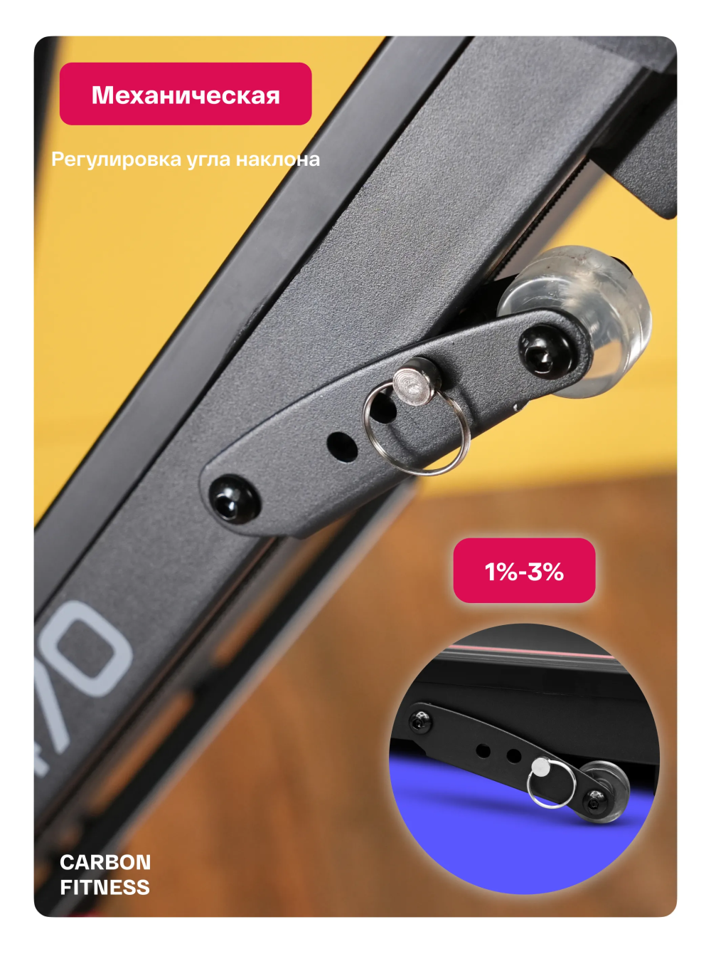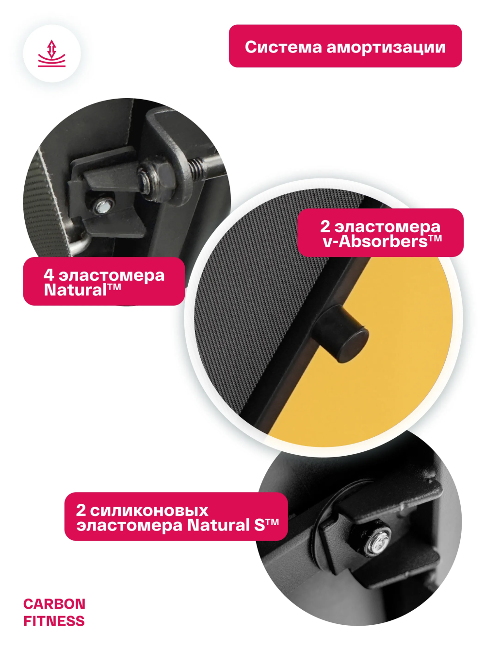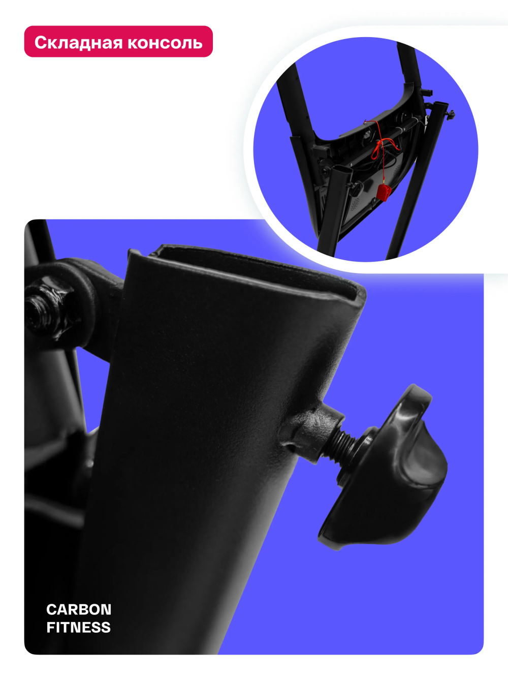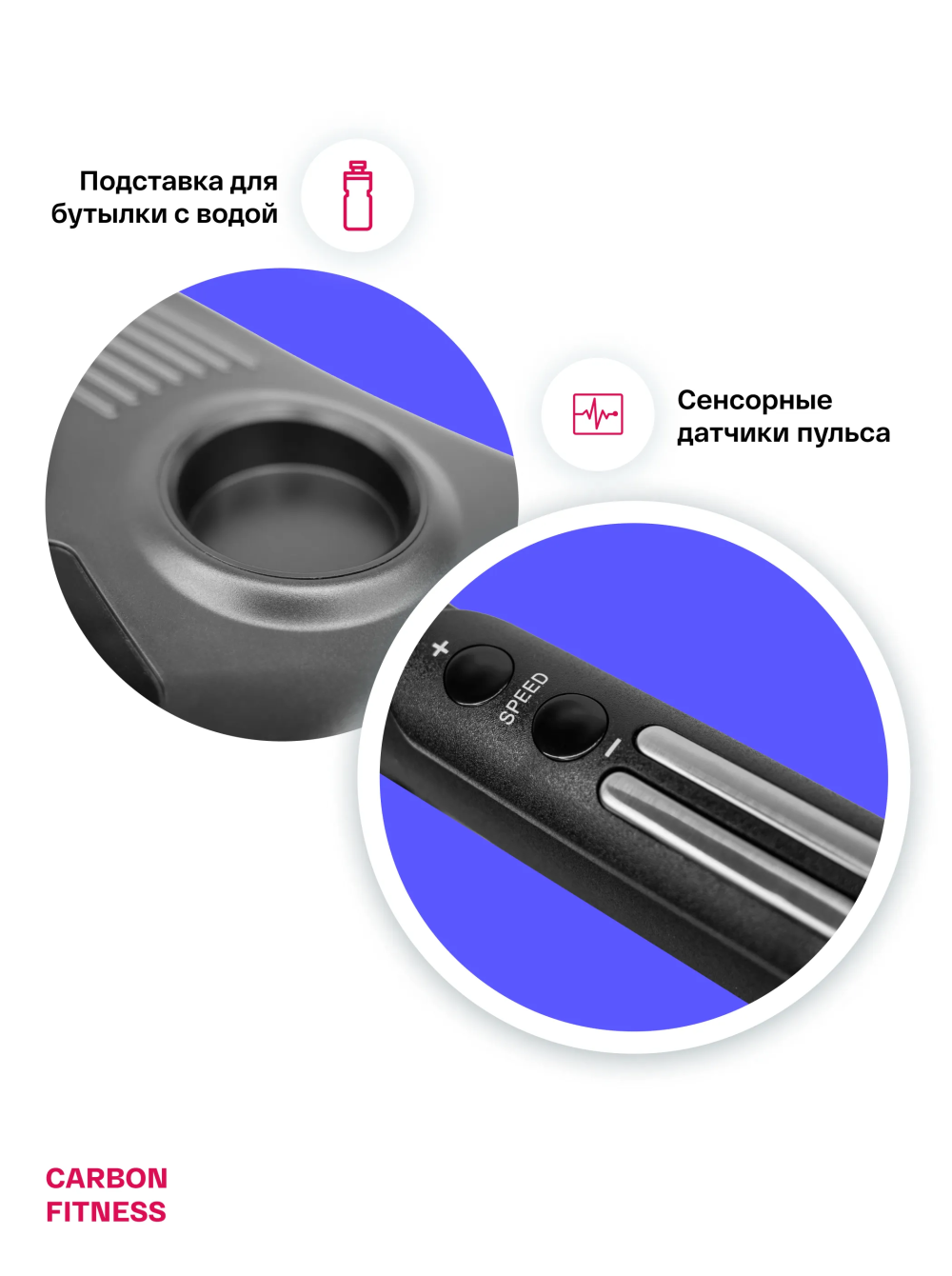 Беговая дорожка домашняя CARBON FITNESS T470 0 отзывов 33990р. Производитель: CARBON Наличие: Есть в наличии Модель: T470 Одежда Обувь Как выбрать одежду своего размера? Купить Купить в один клик Скидки постоянным клиентам! Гарантия качества всех товаров магазина! Описание Отзывов (0) Особенности:Механическая регулировка наклона (3 уровня)РАЗМЕРЫ БЕГОВОГО ПОЛОТНА 110Х40 СМУдобная складная конструкцияСистема амортизацииСпециальный отсек для смазки бегового полотнаСистема складывания soft DropТолщина бегового полотна 1,6 ммШирокие Боковые направляющие для старта и окончания тренировкиЛёгкий способ складывания консольной частиКомфортное измерение пульса во время тренировкиТранспортировочные роликиПодставка под смартфонПодставка под бутылку с водойКлюч безопасности БрендCarbon FitnessАртикулT470Назначение домашнееТип тренажера электрическая беговая дорожкаДвигатель1.75 л.с. DC Leeson Electric Corporation (бесщеточный)Пиковая мощность двигателя, л.с.3.0 DCСкорость, км/ч1-14Максимальный вес пользователя 110Беговое полотно1.6 мм, антискользящееДлина бегового полотна, см112Ширина бегового полотна, см40Регулировка угла наклона ручнаяКоличество уровней наклона3Материал декиМДФ, парафинированнаяТолщина деки12 ммСистема амортизации2 плоских силиконовых эластомеров Natural S™, 4 плоских эластомера Natural™, 2 эластомера v-Absorbers™Измерение пульсаестьКонсоль LEDТип консоли LED дисплей с красной индикациейПоказания консоливремя, скорость, дистанция, калории, жироанализатор, программаОбщее количество программ17Спецификация программбыстрый старт, 12 предустановленных, 3 целевые (время, дистанция, калории), жироанализаторМультимедиаколонки BluetoothИнтеграционные технологииBluetooth для работы с тренировочным мобильным приложением (Spax™, Kinomap™)Язык интерфейсарусский, английскийСкладная конструкция ДаПодставка под планшет/смартфонДаТранспортировочные роликиДаКомпенсаторы неровностей полаДаДополнительные функциисенсорные датчики на поручнях, возможность подключения кардиодатчика Bluetooth через фитнес-приложенияДополнительные особенности тренажеракнопки управления на поручнях, ключ безопасности, система легкой смазки бегового полотна (автосмазка)Длина в рабочем состоянии, см145.3Ширина в рабочем состоянии, см61.7Высота в рабочем состоянии, см111Вес нетто, кг32Вес брутто, кг37Подключение к сети220 ВПроизводительFitathlon Group (подразделение в Германии)Страна изготовленияКНР Беговая дорожка CARBON FITNESS T470 - это высококачественное оборудование, созданное для эффективных и комфортных тренировок в домашних условиях. Сочетая в себе передовые технологии, продуманный дизайн и широкий функционал, эта модель станет надежным помощником на пути к достижению ваших фитнес-целей. CARBON FITNESS T470 оснащена бесщеточным двигателем мощностью 1,75 л.с. с пиковым показателем 3 л.с., обеспечивая плавный разгон скорости от 1 до 14 км/ч. Беговое полотно размером 110x40 см с толщиной 1,6 мм и парафинированной декой из МДФ толщиной 12 мм гарантирует комфорт и безопасность во время тренировок. Система амортизации с 2 плоскими силиконовыми эластомерами Natural S™, 4 плоскими эластомерами Natural™ и 2 эластомерами v-Absorbers™ смягчает нагрузку на суставы. Консоль дорожки оснащена тремя LED-дисплеями с красной индикацией, отображающими ключевые параметры тренировки: время, скорость, дистанцию, калории, жироанализатор. Интерфейс поддерживает русски