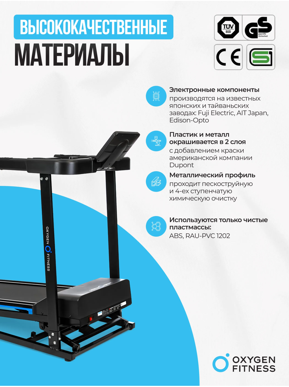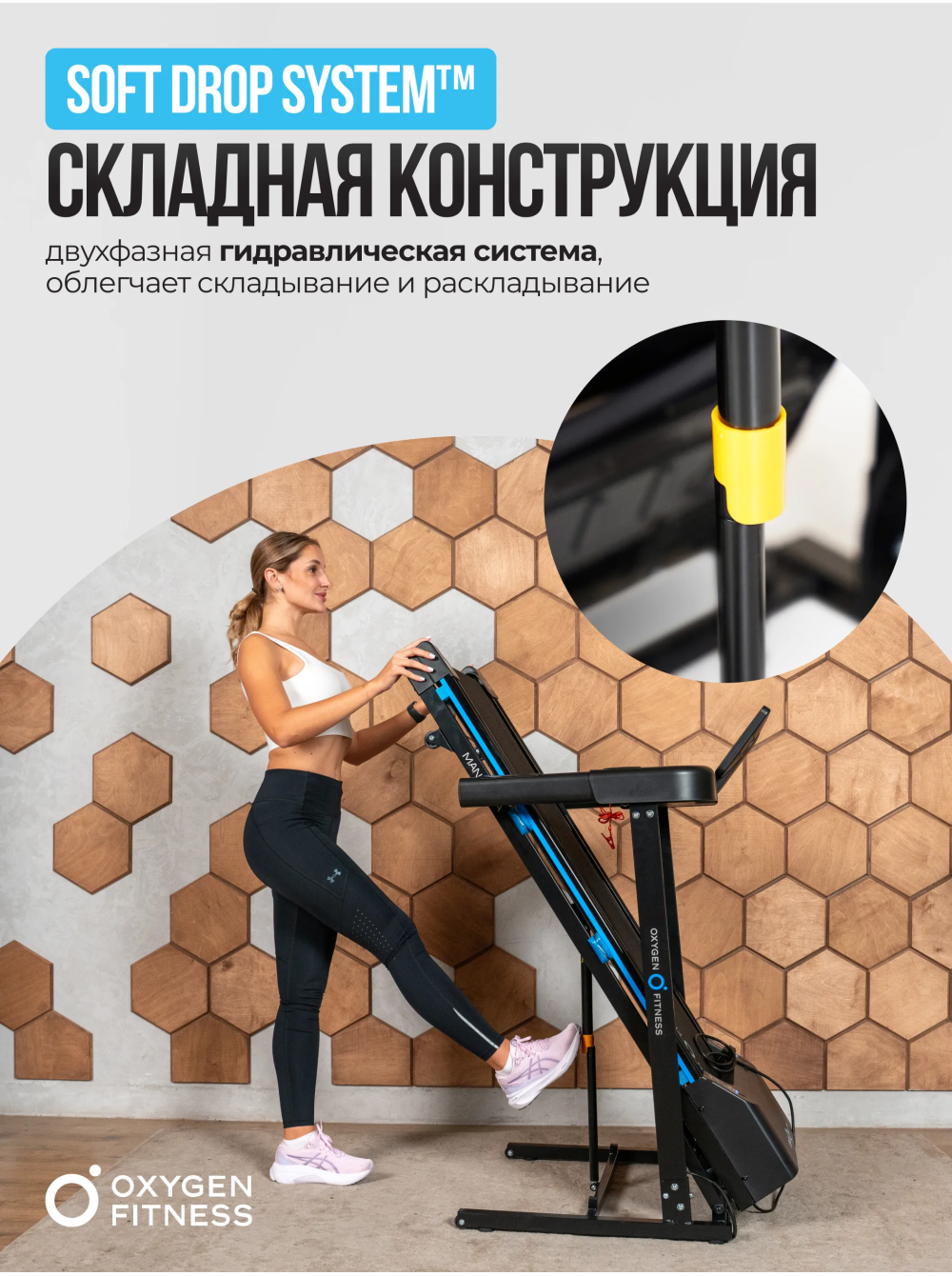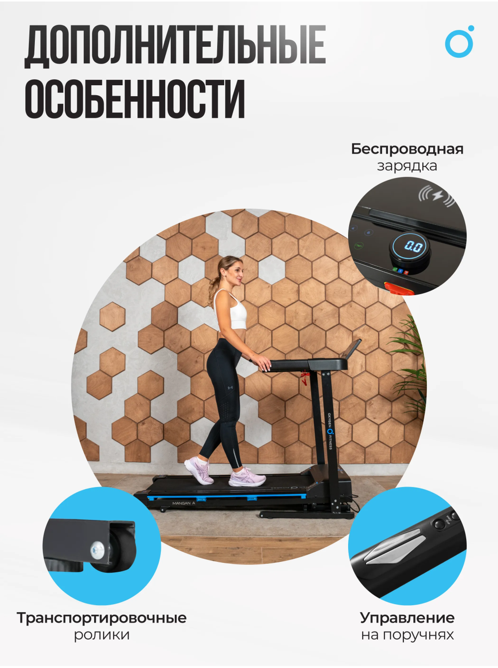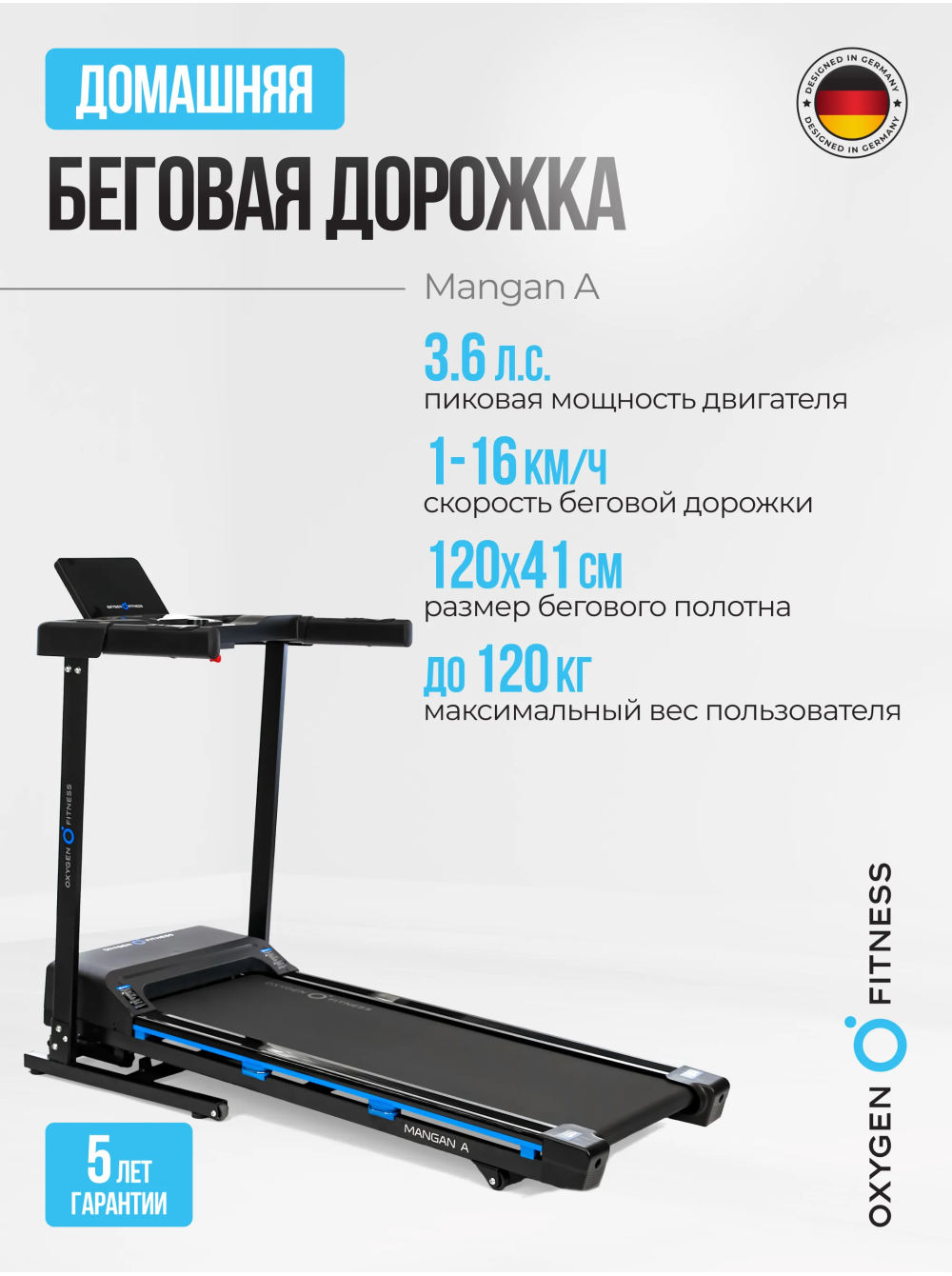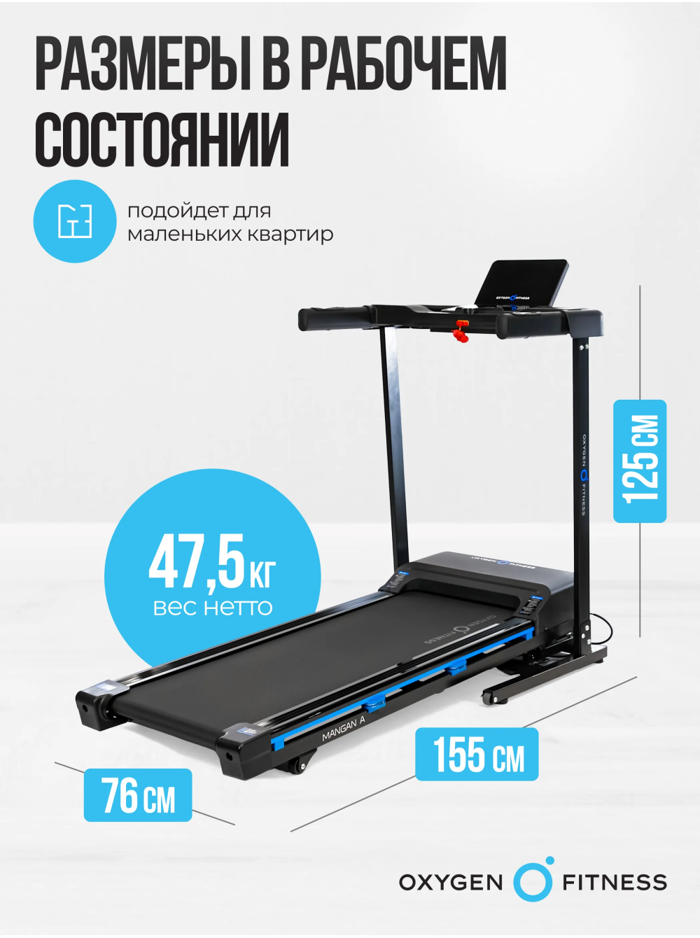 Беговая дорожка домашняя OXYGEN FITNESS MANGAN A 0 отзывов 59990р. Производитель: OXYGEN Наличие: Есть в наличии Модель: MANGAN_A Одежда Обувь Как выбрать одежду своего размера? Купить Купить в один клик Скидки постоянным клиентам! Гарантия качества всех товаров магазина! Описание Отзывов (0) Особенности:система складывания Soft Drop System™ система амортизации PHYSIO-RUN™Беговое полотно размером 120x42 см МНОГОФУНКЦИОНАЛЬНАЯ КОНСОЛЬ С БЕСПРОВОДНОЙ ЗАРЯДКОЙКЛЮЧ БЕЗОПАСНОСТИТРАНСПОРТИРОВОЧНЫЕ РОЛИКИ ПОРУЧНИ С ДАТЧИКАМИ ПУЛЬСА И КЛАВИШАМИ БЫСТРОГО УПРАВЛЕНИЯ КОМПЕНСАТОРЫ НЕРОВНОСТЕЙ ПОЛА БрендOxygen FitnessАртикулMANGAN_AНазначение домашнееТип тренажера электрическая беговая дорожкаДвигатель2.0 л.с. DC Fuji ElectricПиковая мощность двигателя, л.с.3.6 DCСкорость, км/ч1-16Максимальный вес пользователя 120Беговое полотно1.4 мм, долговечное многослойное DiamondДлина бегового полотна, см120Ширина бегового полотна, см41Регулировка угла наклона электроннаяКоличество уровней наклона15Материал декиМДФ, парафинированнаяТолщина деки15 ммСистема амортизации4 силикон-гелиевые подушки с пружинами Physio-Run™Измерение пульсаестьКонсоль LCDТип консоли LCD дисплей с белой индикациейПоказания консолискорость, калории, время, дистанция, пульс, уровень наклона, жироанализатор, бегОбщее количество программ32Спецификация программручной режим, 24 предустановленные, 3 пользовательские, жироанализатор, 3 целевые (время, дистанция, калории)Интеграционные технологииBluetooth для работы с тренировочным мобильным приложением (Fitshow™, Kinomap™, Zwift™)Язык интерфейсарусский, английскийСкладная конструкция ДаПодставка под планшет/смартфонДаТранспортировочные роликиДаДополнительные функциисенсорные датчики на поручнях, возможность подключения кардиодатчика Bluetooth через фитнес-приложенияДополнительные особенности тренажерауправление скоростью и уровнем наклона на поручнях, беспроводная зарядкаДлина в рабочем состоянии, см155Ширина в рабочем состоянии, см76Высота в рабочем состоянии, см125Вес нетто, кг47.5Вес брутто, кг50Подключение к сети220 ВПроизводительFitathlon Group (подразделение в Германии)Страна изготовленияКНР Беговая дорожка OXYGEN FITNESS MANGAN A создана для тех, кто хочет тренироваться дома с комфортом и удовольствием. Оснащенная мощным двигателем Fuji Electric на 2.0 л.с. (с пиковым значением 3.6 л.с.), она разгоняется до 16 км/ч и идеально подходит для пользователей весом до 120 кг. Благодаря диапазону наклона от 1% до 15%, который регулируется электронным способом, эта модель позволяет точно настроить нагрузку, имитируя различные типы рельефа и повышая эффективность тренировок. Особое внимание уделено функциональности и комфорту дорожки MANGAN A. Консоль с LCD-дисплеем (с белой индикацией) отображает такие параметры, как скорость, калории, время, дистанция, пульс и угол наклона. Доступно 32 программы, включая ручной режим, 24 предустановленные программы, 3 целевых (по времени, дистанции и калориям) и даже встроенный жироанализатор. Сенсорные датчики пульса, расположенные на поручнях, помогают отслеживать состояние пользователя, а подключение по Bluetooth открывает доступ к популярным тренировочным приложениям, таким как Fitshow™, Kinomap™ и Zwift™, для увлекательных виртуальных пробежек. Беговое полотно размером 120x42 см выполнено из многослойного материала Diamond, который повышает его износостойкость. Для снижения ударной нагрузки на суставы уста