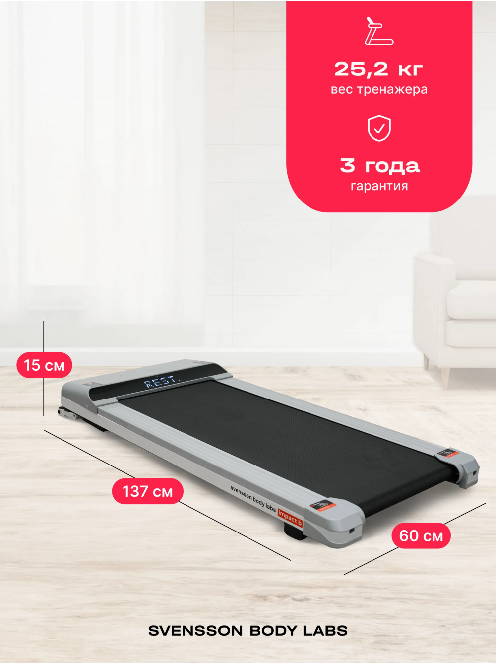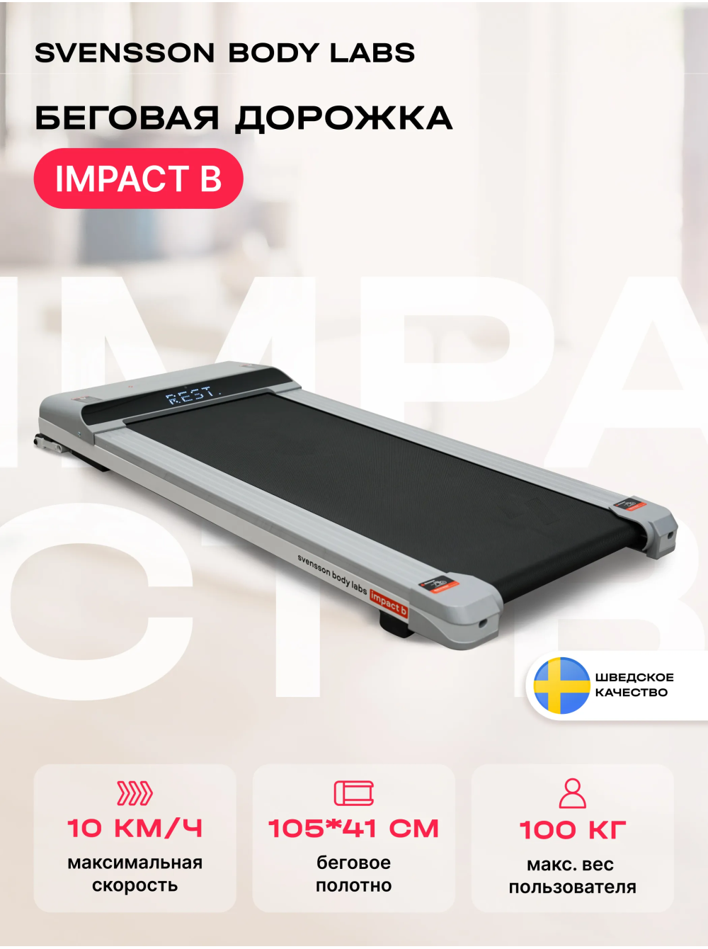 Беговая дорожка домашняя SVENSSON BODY LABS IMPACT B 0 отзывов 31990р. Производитель: SVENSSON INDUSTRIAL Наличие: Есть в наличии Модель: IMPACT_B Документы (инструкции): mpdf.php?url=%2Fcatalog%2Fbegovye-dorozhki%2Fbegovaya-dorozhka-domashnyaya-svensson-body-labs-impact-b%2F&pdfversion=1&name_file=begovaya-dorozhka-domashnyaya-svensson-body-labs-impact-b Одежда Обувь Как выбрать одежду своего размера? Купить Купить в один клик Скидки постоянным клиентам! Гарантия качества всех товаров магазина! Описание Отзывов (0) Документы Особенности:Возможность горизонтального храненияАмортизационная система Soft LEG™Амортизационная система Naturalтранспортировочные ролики БрендSvensson Body LabsАртикулIMPACT_BНазначение домашнееТип тренажера электрическая беговая дорожкаДвигатель1.35 л.с. DC Mitsubishi Motors Corporation (бесщеточный)Пиковая мощность двигателя, л.с.2.5 DCСкорость, км/ч1-10Максимальный вес пользователя 100Беговое полотно1.6 мм, многослойное антискользящееДлина бегового полотна, см105Ширина бегового полотна, см41Материал декиМДФ, парафинированнаяТолщина деки12 ммСистема амортизации4 плоских силиконовых эластомера Natual S™, 2 плоских эластомера Natural™, система Soft LEG™Консоль LEDТип консоли LED дисплей с белой индикацией на моторном отсекеПоказания консоливремя, скорость, дистанция, калорииОбщее количество программ4Спецификация программбыстрый старт, 3 целевые (время, дистанция, калории)Интеграционные технологииBluetooth для работы с тренировочным мобильным приложением (Spax™, Kinomap™)Язык интерфейсаанглийскийПодставка под планшет/смартфонДаТранспортировочные роликиДаДополнительные функциивозможность подключения кардиодатчика Bluetooth через фитнес-приложенияДополнительные особенности тренажерапульт дистанционного управления, вертикальное хранениеДлина в рабочем состоянии, см137Ширина в рабочем состоянии, см60Высота в рабочем состоянии, см15Вес нетто, кг25.2Вес брутто, кг30.6Подключение к сети220 ВПроизводительFitathlon Group (подразделение в Швеции)Страна изготовленияКНР Svensson Body Labs IMPACT B — беговая дорожка, воплощающая стиль и технологии в новом светлом монохромном дизайне. Эта модель создана для домашних тренировок, сочетая современный минимализм, комфорт и надежность. Она идеально впишется в любой интерьер и станет надежным спутником на пути к здоровому образу жизни. Электрическая беговая дорожка оснащена бесщеточным двигателем Mitsubishi Motors Corporation с мощностью 1,35 л.с. DC и пиковым показателем 2,5 л.с., что обеспечивает плавный разгон скорости от 1 до 10 км/ч. Комфортное беговое полотно размером 105х41 см с толщиной 1,6 мм и парафинированной декой (12 мм). LED-дисплей с белой индикацией отображает ключевые параметры тренировки. Для синхронизации с мобильными приложениями Spax™ и Kinomap™ предусмотрен встроенный Bluetooth. IMPACT B сочетает компактность, функциональность и готовность к использованию прямо из коробки. Вес тренажера составляет всего 25,2 кг, а его размеры составляют 137х60х15 см, что позволяет хранить дорожку в вертикальном положении у стены. При этом дорожка выдерживает максимальный вес пользователя до 100 кг, что делает ее универсальным решением для всей семьи. Ключевые преимущества Svensson Body Labs IMPACT B: • скорость от 1 до 10 км/ч; • комфортное беговое полотно 105х41 см; • синхронизация с приложениями через Bluetooth; • легкий вес и вертикальное хранение. Написать отзыв Ваше имя: Ваш отзыв: Примечание: HTML разметка не поддерживается! Используйте обычный текст. Оценка: Плохо Хорошо Отправить отзыв mpdf.php?url=%2Fca