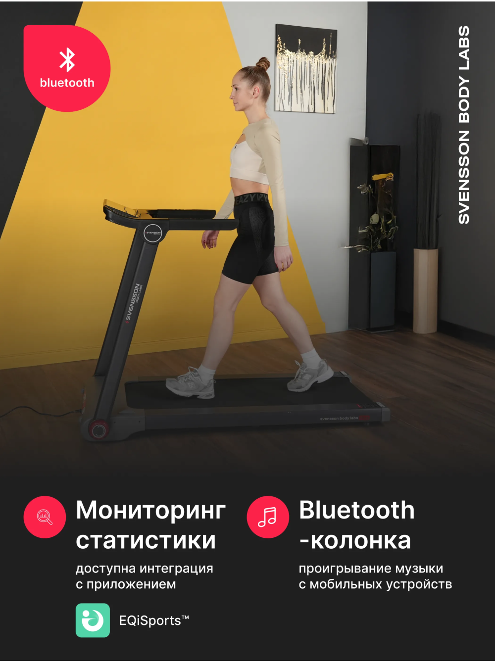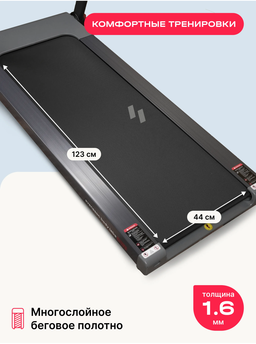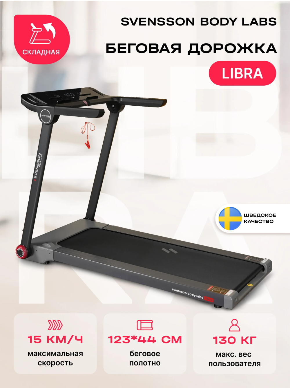 Беговая дорожка домашняя SVENSSON BODY LABS LIBRA 0 отзывов 62990р. Производитель: SVENSSON INDUSTRIAL Наличие: Есть в наличии Модель: LIBRA Одежда Обувь Как выбрать одежду своего размера? Купить Купить в один клик Скидки постоянным клиентам! Гарантия качества всех товаров магазина! Описание Отзывов (0) Особенности:Широкое беговое полотноСкладная конструкцияУдобные фиксаторыВертикальное хранениеШирокие поручни с датчиками пульса и быстрыми кнопками управления дорожкойПодставка под смартфон БрендSvensson Body LabsАртикулLIBRAНазначение домашнееТип тренажера электрическая беговая дорожкаДвигатель2.25 л.с. DC Mitsubishi Motors CorporationПиковая мощность двигателя, л.с.4.4 DCСкорость, км/ч1-15Максимальный вес пользователя 130Беговое полотно1.6 мм, многослойное антискользящееДлина бегового полотна, см123Ширина бегового полотна, см44Материал декиМДФ, парафинированнаяТолщина деки15 ммСистема амортизации8 эластомеров, 2 демпфирующие подушкиИзмерение пульсаестьКонсоль LEDТип консоли LED дисплей с голубой индикациейПоказания консоливремя, скорость, дистанция, калории, пульсОбщее количество программручной режимСпецификация программбыстрый старт, ручной режимМультимедиаколонки BluetoothИнтеграционные технологииBluetooth для работы с тренировочным мобильным приложением (EQIsports™)Язык интерфейсарусский, английскийСкладная конструкция ДаПодставка под планшет/смартфонДаТранспортировочные роликиДаКомпенсаторы неровностей полаДаДополнительные функциисенсорные датчики на поручнях, кнопки управления на поручнях (старт/стоп, скорость), возможность подключения кардиодатчика Bluetooth через фитнес-приложенияДополнительные особенности тренажера пульт управления, вертикальное хранениеДлина в рабочем состоянии, см145.6Ширина в рабочем состоянии, см76.7Высота в рабочем состоянии, см107.5Вес нетто, кг47.3Вес брутто, кг55.3Подключение к сети220 ВПроизводительFitathlon Group (подразделение в Швеции)Страна изготовленияКНР Беговая дорожка SVENSSON BODY LABS LIBRA — это надежное решение для тех, кто хочет поддерживать физическую активность в домашних условиях. С максимальной нагрузкой до 130 кг и мощным двигателем 2,25 л.с. (пиковая мощность 4,4 л.с.), данная модель обеспечивает плавный и комфортный бег с диапазоном скорости от 1 до 15 км/ч. Это позволяет пользователям адаптировать тренировки под свои индивидуальные потребности, начиная с легкой разминки и заканчивая интенсивными пробежками. Беговая дорожка оснащена системой амортизации, состоящей из 8 эластомеров и 2 демпфирующих подушек, что позволяет значительно снизить нагрузку на суставы и минимизировать риск травм. Кроме того, дорожка имеет прочное беговое полотно толщиной 1,6 мм и антикоррозийную обработку рамы, что обеспечивает долговечность и надежность устройства. Управление на поручнях с кнопками СТАРТ/СТОП и регулировки скорости добавляет удобства во время тренировок. С дорожкой SVENSSON BODY LABS LIBRA вы можете наслаждаться тренировками с музыкой благодаря встроенной колонке Bluetooth. Дисплей LED с голубой индикацией показывает важные параметры: время, скорость, дистанцию, калории и пульс, что помогает отслеживать прогресс. Также предусмотрен режим быстрого старта и ручной режим, что делает тренировки более адаптивными. Беговая дорожка поддерживает подключение к мобильным приложениям через Bluetooth для более эффективного контроля за тренировками. Беговая дорожка SVENSSON BODY LABS