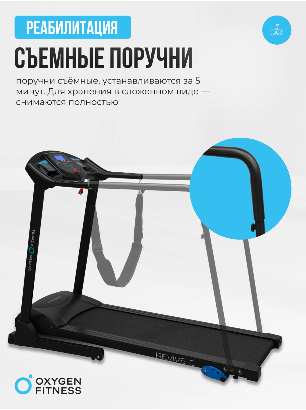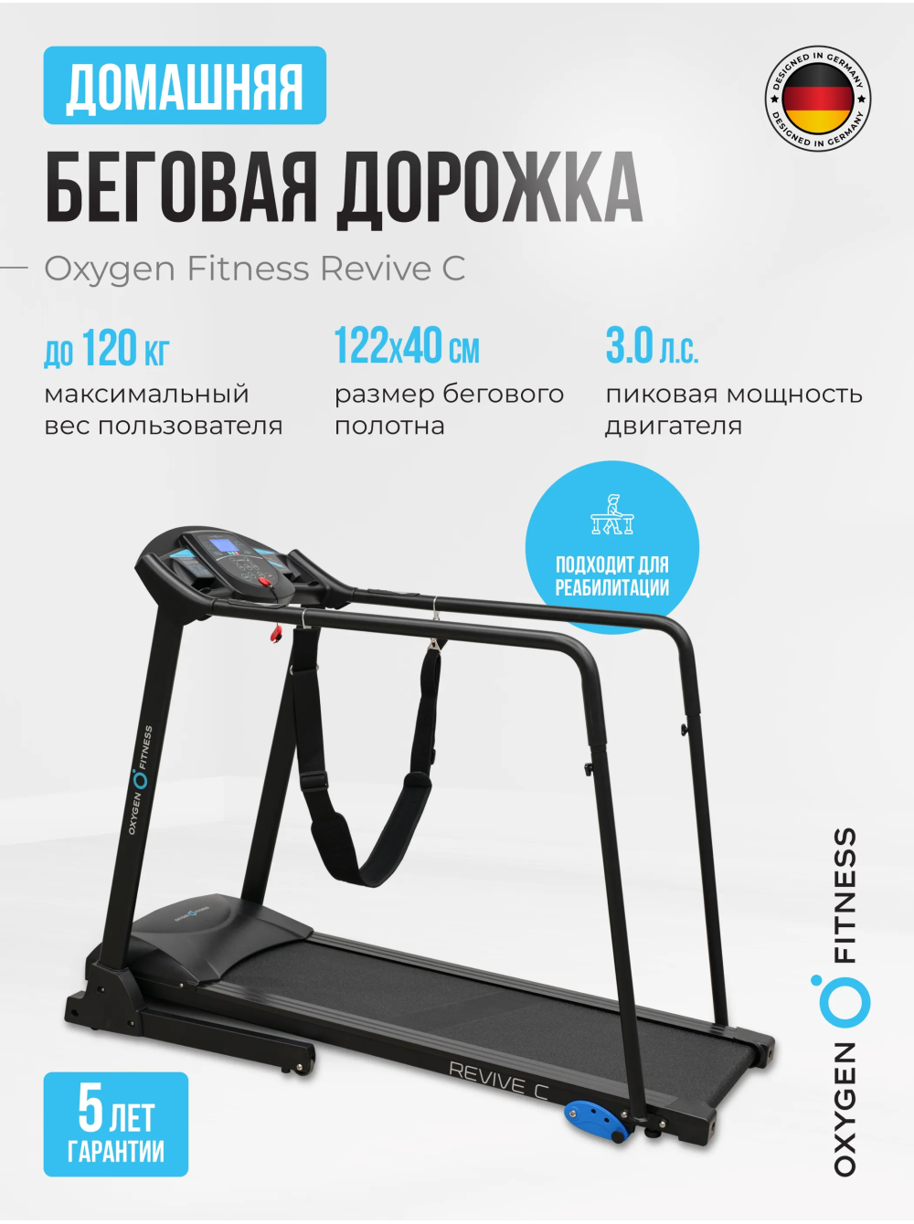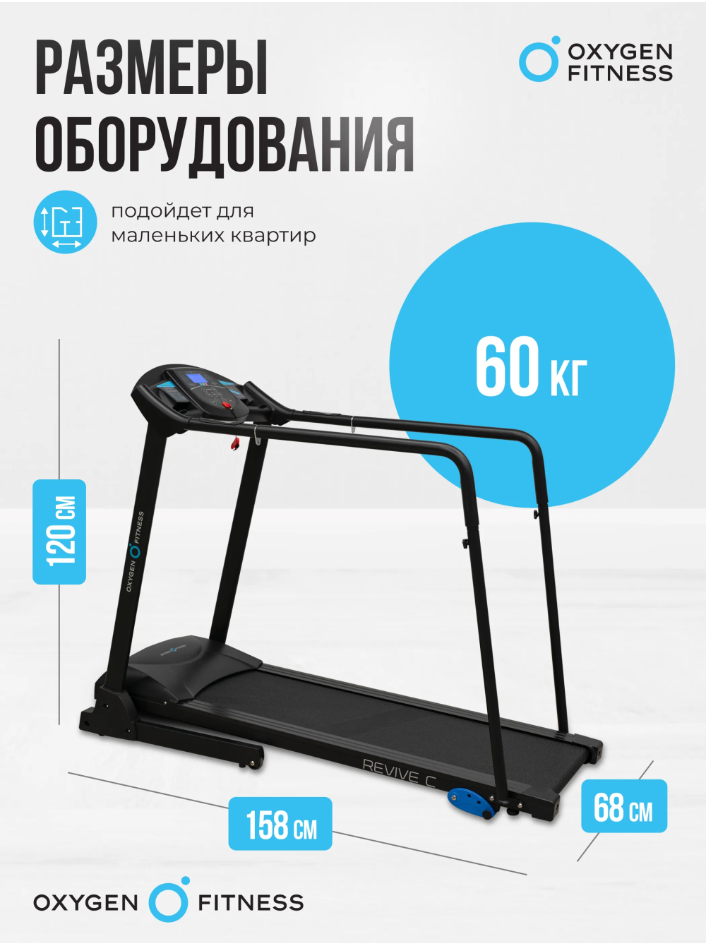 Беговая дорожка реабилитационная домашняя OXYGEN FITNESS REVIVE C 0 отзывов 49990р. Производитель: OXYGEN Наличие: Есть в наличии Модель: REVIVE_C Одежда Обувь Как выбрать одежду своего размера? Купить Купить в один клик Скидки постоянным клиентам! Гарантия качества всех товаров магазина! Описание Отзывов (0) Особенности: БрендOxygen FitnessАртикулREVIVE_CНазначение домашнееТип тренажера электрическая беговая дорожкаДвигатель1.5 л.с. DC Fuji ElectricПиковая мощность двигателя, л.с.3.0 DCСкорость, км/ч0,8 - 12Максимальный вес пользователя 120Беговое полотно1.4 мм антискользящееДлина бегового полотна, см122Ширина бегового полотна, см40Регулировка угла наклона ручнаяКоличество уровней наклона3Материал декиМДФ, парафинированнаяТолщина деки15 ммСистема амортизации4 cиликон-гелиевые амортизирующие подушки ortho-Deck Masters™, 4 плоских эластомера Natural™Измерение пульсаестьКонсоль LCDТип консоли LCD дисплей с голубой индикациейПоказания консоливремя, скорость, дистанция, калории, пульс, программаОбщее количество программ14Спецификация программбыстрый старт, 9 предустановленных, 3 режима обратного отсчета, жироанализаторИнтеграционные технологииBluetooth для работы с тренировочным мобильным приложением (Fitshow™, Kinomap™, Zwift™)Язык интерфейсарусский, английскийСкладная конструкция ДаТранспортировочные роликиДаКомпенсаторы неровностей полаДаДополнительные функциикнопки быстрого переключения скорости на консоли, сенсорные датчики на поручнях, возможность подключения кардиодатчика Bluetooth через фитнес-приложенияДополнительные особенности тренажераподходит для реабилитации, отсеки для аксессуаров, кнопки управления СТАРТ\СТОП и скоростью на поручнях, ключ безопасности, поручни с антискользящим покрытием, страховочный ременьДлина в рабочем состоянии, см158Ширина в рабочем состоянии, см68Высота в рабочем состоянии, см120Вес нетто, кг54Вес брутто, кг60Подключение к сети220 ВПроизводительFitathlon Group (подразделение в Германии)Страна изготовленияКНР Беговая дорожка OXYGEN FITNESS REVIVE C — это идеальный тренажер для тех, кто стремится восстановиться после травм или поддерживать физическую активность в условиях домашнего комфорта. Разработанная с акцентом на безопасность и комфорт, эта дорожка оснащена мощным двигателем 1.5 л.с. и пиковой мощностью до 3.0 л.с., что позволяет разгоняться до скорости 12 км/ч. Благодаря возможности ручной регулировки угла наклона и продуманной системе амортизации, она помогает минимизировать нагрузку на суставы, что особенно важно для реабилитации. Складная конструкция делает ее удобной для хранения, а компактные размеры позволяют легко разместить ее даже в небольших помещениях. Беговое полотно размером 122 см в длину и 40 см в ширину выполнено из антискользящего материала толщиной 1.4 мм, что обеспечивает безопасность во время занятий. Дека из МДФ с парафинированной поверхностью толщиной 15 мм гарантирует надежную поддержку. Система амортизации состоит из 4 силикон-гелиевых подушек ortho-Deck Masters™ и 4 плоских эластомеров Natural™, что значительно снижает нагрузку на суставы и обеспечивает комфортные условия для тренировки. Ручная регулировка угла наклона с тремя уровнями позволяет настроить тренировку под индивидуальные потребности. OXYGEN FITNESS REVIVE C оснащена LCD дисплеем с голубой индикацией, который отображает важные параметры: время, скорость, дистанцию, количество сожженны