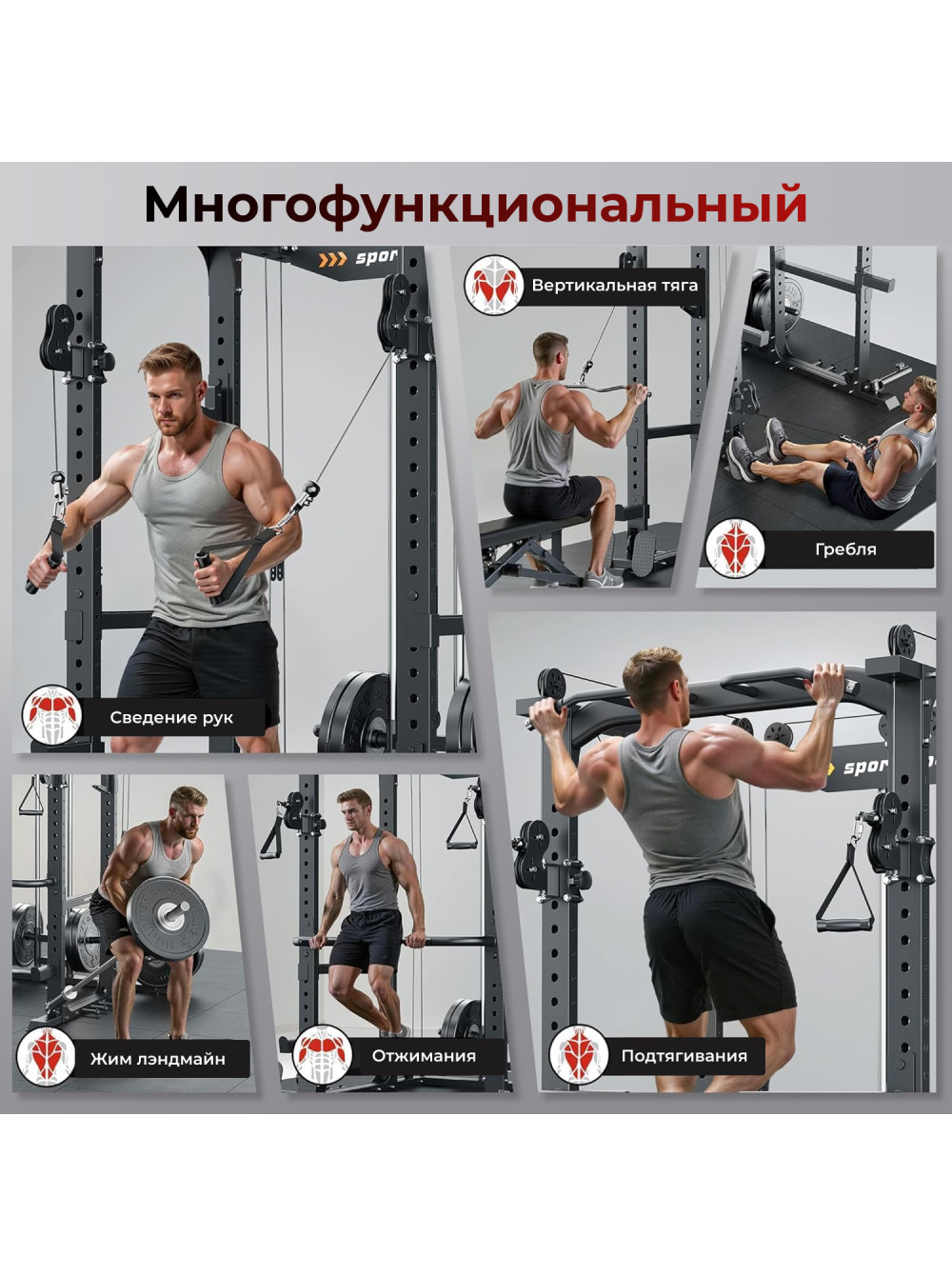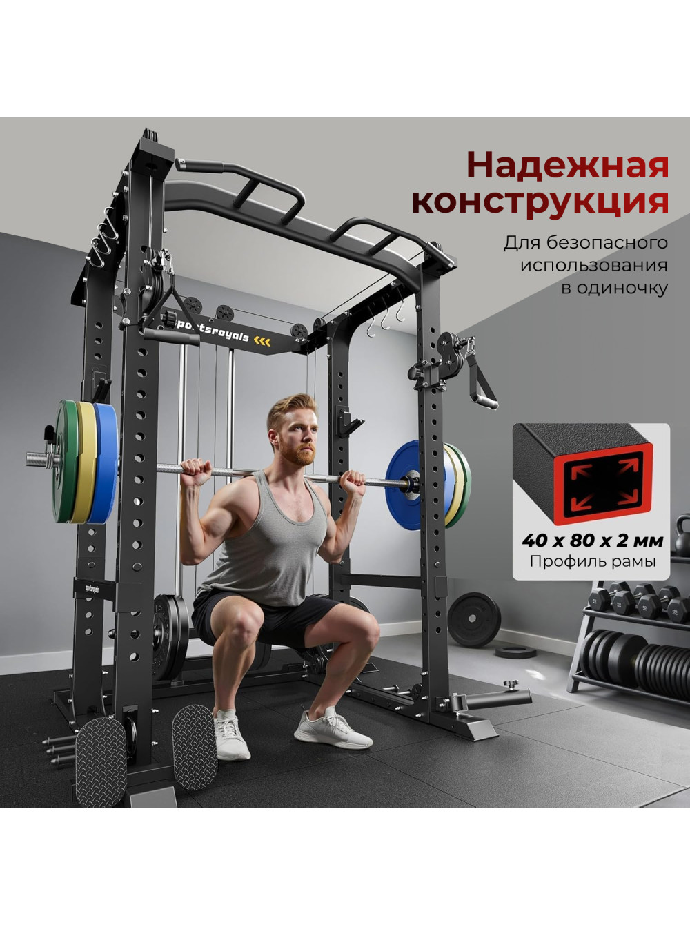 Силовая рама многофункциональная DFC D026 0 отзывов 87989р. Оптовая цена: 79990р. для покупки по оптовой цене свяжитесь с нами по телефону Производитель: DFC Наличие: Есть в наличии Модель: D026 Документы (инструкции): Silovaya-rama-mnogofynkcionalnaya-DFC-D026.pdf Одежда Обувь Как выбрать одежду своего размера? Купить Купить в один клик Скидки постоянным клиентам! Гарантия качества всех товаров магазина! Описание Отзывов (0) Документы Размер упаковки204 х 29 х 14 смРазмер упаковки 2145,5 х 45 х 25 смРазмер упаковки 360 х 50 х 20 смВес упаковки36,9 кгВес упаковки 245 кгВес упаковки 331,8 кгВес107,4 кгГарантия12 месяцевСтрана производстваКитайОбщая нагрузка120 кгПосадочный диаметр50 ммПрофиль рамы50 х 50 х 1,5 ммТолщина тросов5 мм Силовая рама многофункциональная DFC D026 — компактное и удобное решение для домашних тренировок, позволяющее выполнять широкий спектр силовых упражнений, включая подтягивания, отжимания на брусьях, тягу верхнего и нижнего блока. Профиль рамы 40*80*2 мм, Максимальная статическая нагрузка до 1000 кг, что обеспечивает безопасную и комфортную эксплуатацию тренажёра для пользователей разного уровня подготовки. Рама имеет прочный профиль и посадочный диаметр, а толщина тросов и рукояти для тяги обеспечивают надёжность и стабильность при выполнении упражнений. Тренажёр компактный и удобный, легко размещается в домашних условиях и не занимает много места. Прочная конструкция и качественные материалы гарантируют долговечность и устойчивость даже при регулярных занятиях. Силовая рама многофункциональная DFC D026 сочетает компактность, эргономичность и многоуровневую регулировку, обеспечивая универсальность использования и возможность адаптации под индивидуальные параметры пользователя. Она идеально подходит для домашних тренировок и позволяет безопасно развивать силу, выносливость и мышечный корсет. Гарантия на детали подверженные естественному износу в процессе эксплуатации — до 6 месяцев с момента установки тренажера при условии регулярного планового ТО. Важно: гарантия не распространяется на преждевременный износ из-за чрезмерной эксплуатации тренажера. Написать отзыв Ваше имя: Ваш отзыв: Примечание: HTML разметка не поддерживается! Используйте обычный текст. Оценка: Плохо Хорошо Отправить отзыв Silovaya-rama-mnogofynkcionalnaya-DFC-D026.pdf