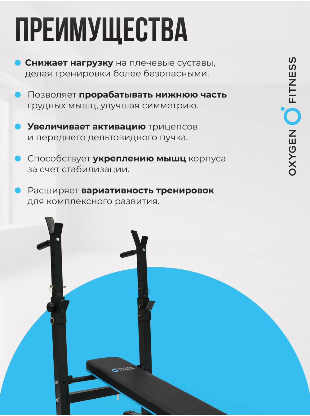 Силовая скамья многофункциональная домашняя OXYGEN FITNESS TAURUS 0 отзывов 8990р.10990р. Вы экономите: 2000р. (-18%) Производитель: OXYGEN Наличие: Есть в наличии Модель: TAURUS Документы (инструкции): mpdf.php?url=%2Fcatalog%2Fsilovoe-oborudovanie%2Fsilovye-skami-i-stoyki%2Fsilovaya-skamya-mnogofunktsionalnaya-domashnyaya-oxygen-fitness-taurus%2F&pdfversion=1&name_file=silovaya-skamya-mnogofunktsionalnaya-domashnyaya-oxygen-fitness-taurus Одежда Обувь Как выбрать одежду своего размера? Купить Купить в один клик Скидки постоянным клиентам! Гарантия качества всех товаров магазина! Описание Отзывов (0) Документы Особенности:большая площадь рабочей зоны (104*23, толщина подушки 5 см)возможность смены угла наклона сиденьяскладная конструкцияпрорезиненный отбойник7 уровней регулировки стойки по высотеудобная платформа для грифа штангиантискользящие рукоятимягкие обрезиненные ножки БрендOxygen FitnessАртикулTAURUSНазначение домашнееТип тренажера скамьиСиденье104*23, толщина подушки 5 смПрофиль сечения рамыквадратШирина профиля рамы, мм50Высота профиля рамы, мм50Вес нетто, кг14.85Дополнительно7 уровней регулировки стойки по высоте, регулируемая опораВес брутто, кг16.75Максимальный вес пользователя, кг140ПроизводительFitathlon Group (подразделение в Германии)Страна изготовленияКНРДлина в рабочем состоянии, см122Ширина в рабочем состоянии, см66Высота в рабочем состоянии, см114Высота в сложенном виде, см131Длина в сложенном виде, см43Ширина в сложенном виде, см66 Многофункциональная силовая скамья OXYGEN FITNESS TAURUS — это идеальный выбор для тех, кто хочет эффективно заниматься спортом в домашних условиях. С помощью этого оборудования вы сможете выполнять широкий спектр силовых упражнений для всех групп мышц. Скамья сочетает в себе функциональность и компактный дизайн, что делает ее отличным дополнением к вашему домашнему тренажерному залу. Скамья OXYGEN FITNESS TAURUS имеет прочный квадратный профиль рамы размером 50x50 мм, обеспечивая надежность и стабильность во время тренировок. С максимальным весом пользователя до 140 кг, она подходит для большинства атлетов. Сиденье размером 104x23 см с толщиной подушки 5 см обеспечивает комфорт во время выполнения упражнений. Скамья оснащена 7 уровнями регулировки стойки по высоте и регулируемой опорой, что позволяет адаптировать оборудование под ваши индивидуальные нужды. Скамья легко складывается, что делает ее удобной для хранения. В сложенном виде ее размеры составляют 43 см в длину, 66 см в ширину и 131 см в высоту. В рабочем состоянии длина скамьи составляет 122 см, ширина — 66 см, а высота — 114 см, что обеспечивает достаточное пространство для комфортных тренировок. Это делает OXYGEN FITNESS TAURUS отличным выбором для тех, у кого ограниченное пространство для тренировки. Скамья OXYGEN FITNESS TAURUS —надежный партнер в достижении ваших фитнес-целей. Ключевые преимущества OXYGEN FITNESS TAURUS: • прочный квадратный профиль рамы (50x50 мм) для надежности и устойчивости; • 7 уровней регулировки стойки по высоте и регулируемая опора для индивидуальной настройки; • комфортабельное сиденье размером 104x23 см с толщиной подушки 5 см для удобства во время тренировок; • максимальный вес пользователя до 140 кг, что делает скамью подходящей для большинства атлетов; • компактные размеры и возможность складывания для легкого хранения и интеграции в любое домашнее пространство. Написать отзыв Ваше имя: Ваш отзыв: Примечание: HTML разметка не поддерживается! Используйте обычный текст. Оценка: Плохо Хорошо Отпра
