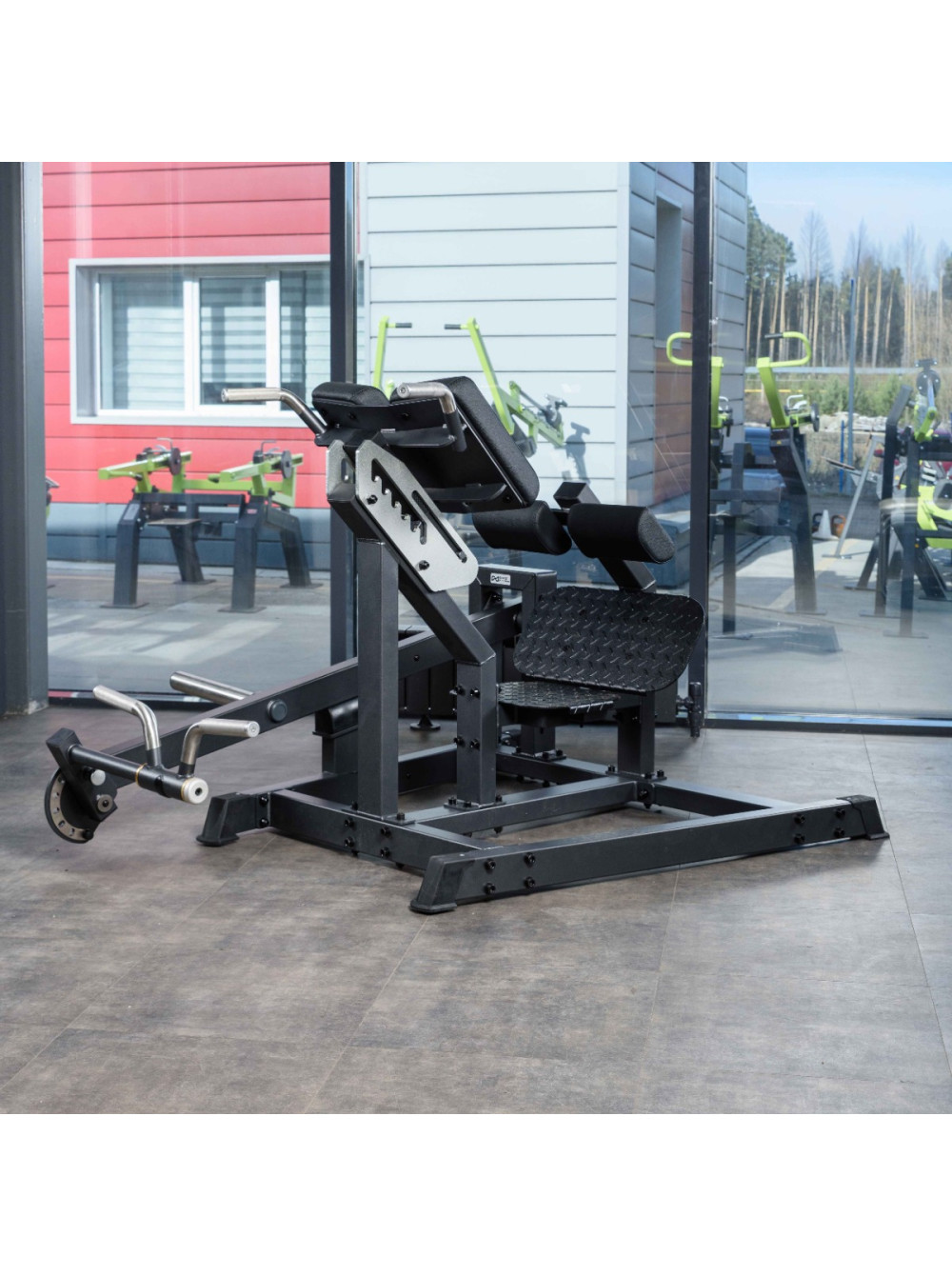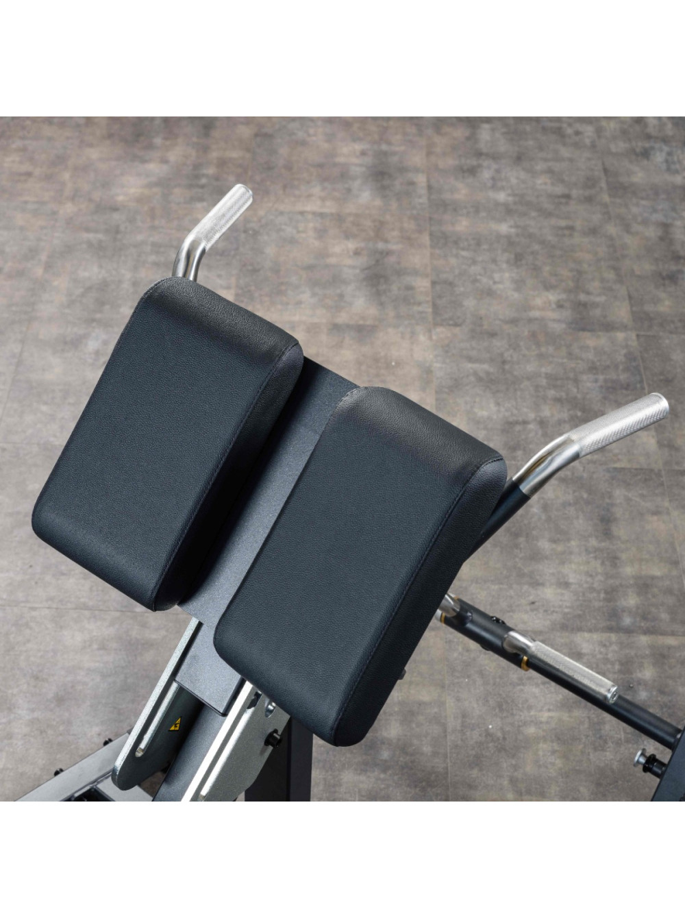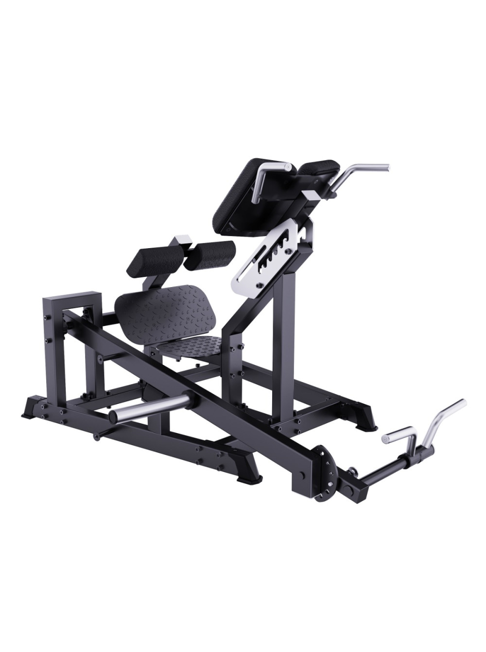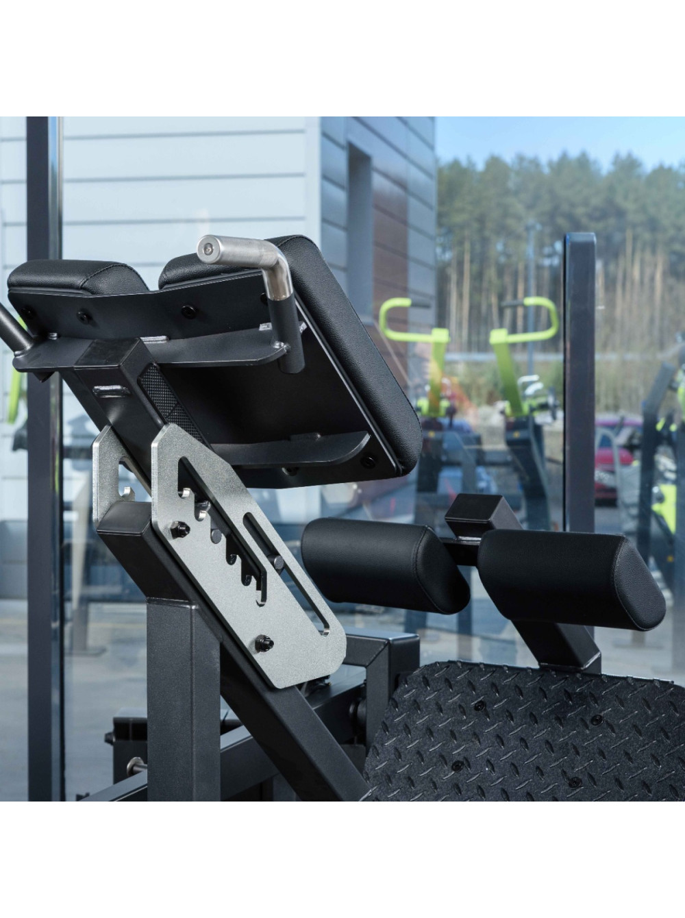 Профессиональный тренажёр для коммерческого использования A627 Гиперэкстензия нагружаемая для проработки мышц задней поверхности бедра, большой ягодичной мышцы и поясничного отдела. Конструкция с подвижным рычагом позволяет выполнять упражнение с регулируемой нагрузкой и точной амплитудой движения без необходимости удерживать дополнительный вес в руках. Основание тренажёра выполнено из стального прямоугольного профиля 80?50 мм с толщиной стенки 3 мм. Все элементы изготавливаются на высокоточном лазерном оборудовании с ЧПУ, что обеспечивает точность геометрии и стабильность конструкции. Несущие узлы соединены методом роботизированной сварки, исключающим перекосы и повышающим эксплуатационную надёжность. На металлические элементы после антикоррозийной обработки нанесено двухслойное порошковое напыление в электростатическом поле для обеспечения прочности покрытия и устойчивости к истиранию. Цветовое исполнение: графит (возможна индивидуальная окраска под проект). Нагрузка: свободные веса. Подвижный рычаг снабжён хромированным накопителем под диски длиной 320 мм и диаметром 45 мм, рассчитанным на диски с посадочным отверстием 50 мм. Торец накопителя закрыт пластиковой заглушкой. На подвижном рычаге и на раме установлены металлические фиксаторы для крепления эспандеров длиной 100 мм. Фиксаторы имеют торцевую упорную пластину, предотвращающую соскальзывание эспандеров и обеспечивающую надёжную фиксацию при динамических нагрузках. Рычаг снабжён двумя рукоятями V-образной формы, положение которых регулируется по дугообразной направляющей в шести фиксированных положениях. Дополнительно рукояти имеют ограниченное свободное движение по полукруглой траектории, что обеспечивает естественную биомеханику при выполнении упражнения. Рабочая зона тренажёра оснащена двумя отдельными подушками для опоры бёдер длиной 340 мм и шириной 190 мм каждая. Расстояние между подушками 85 мм. Подушки имеют скруглённые края для комфорта и равномерного распределения давления. Высота подушек регулируется вручную в шести положениях при помощи механического фиксатора. Начальная высота между верхним краем подушки и наклонной платформой для ног составляет 920 мм, максимальная – 1110 мм. В зоне опоры корпуса установлены две металлические рукояти диаметром 30 мм и длиной 125 мм с ромбовидной накаткой для удобного хвата при регулировке положения подушек и размещении спортсмена. Торцы рукоятей закрыты металлическими заглушками с болтовой фиксацией. Платформы для ног выполнены из листовой стали толщиной 4 мм с противоскользящим рифлением и скруглёнными краями. Конструкция включает две рабочие зоны: – горизонтальную платформу для размещения спортсмена при заходе на тренажёр длиной 300 мм, шириной 365 мм (в крайних точках). – наклонную платформу для упора ног при выполнении упражнения длиной 265 мм, шириной 550 мм (в крайних точках). Платформа имеет постоянный угол наклона, не требующий регулировки. В зоне опоры ног установлены две подушки для фиксации голеней, обеспечивающие устойчивое положение тела во время выполнения упражнения. Размер одной подушки: длина 145 мм, ширина 225 мм. Расстояние между подушками: 100 мм. Все мягкие элементы – подушки для опоры бёдер и фиксации голеней выполнены из вспененного полиуретана, обеспечивающего оптимальную плот