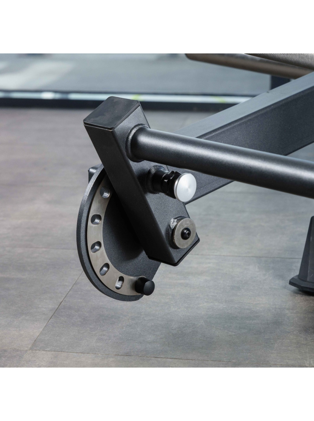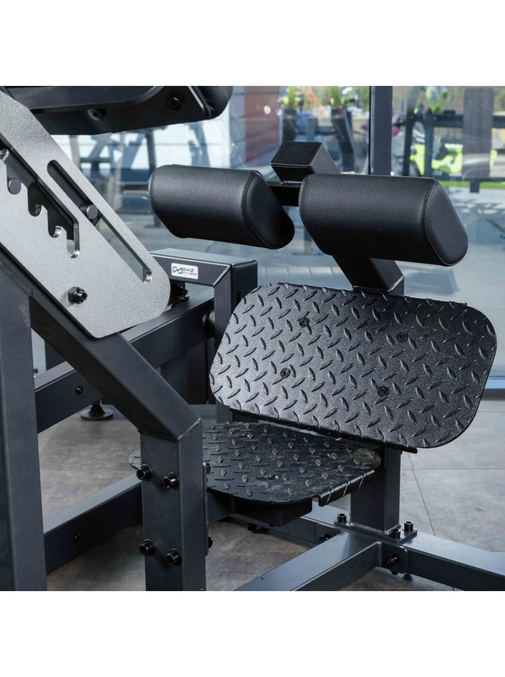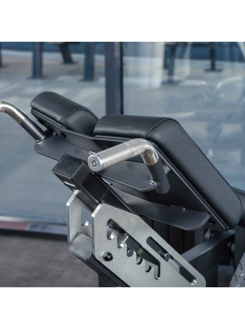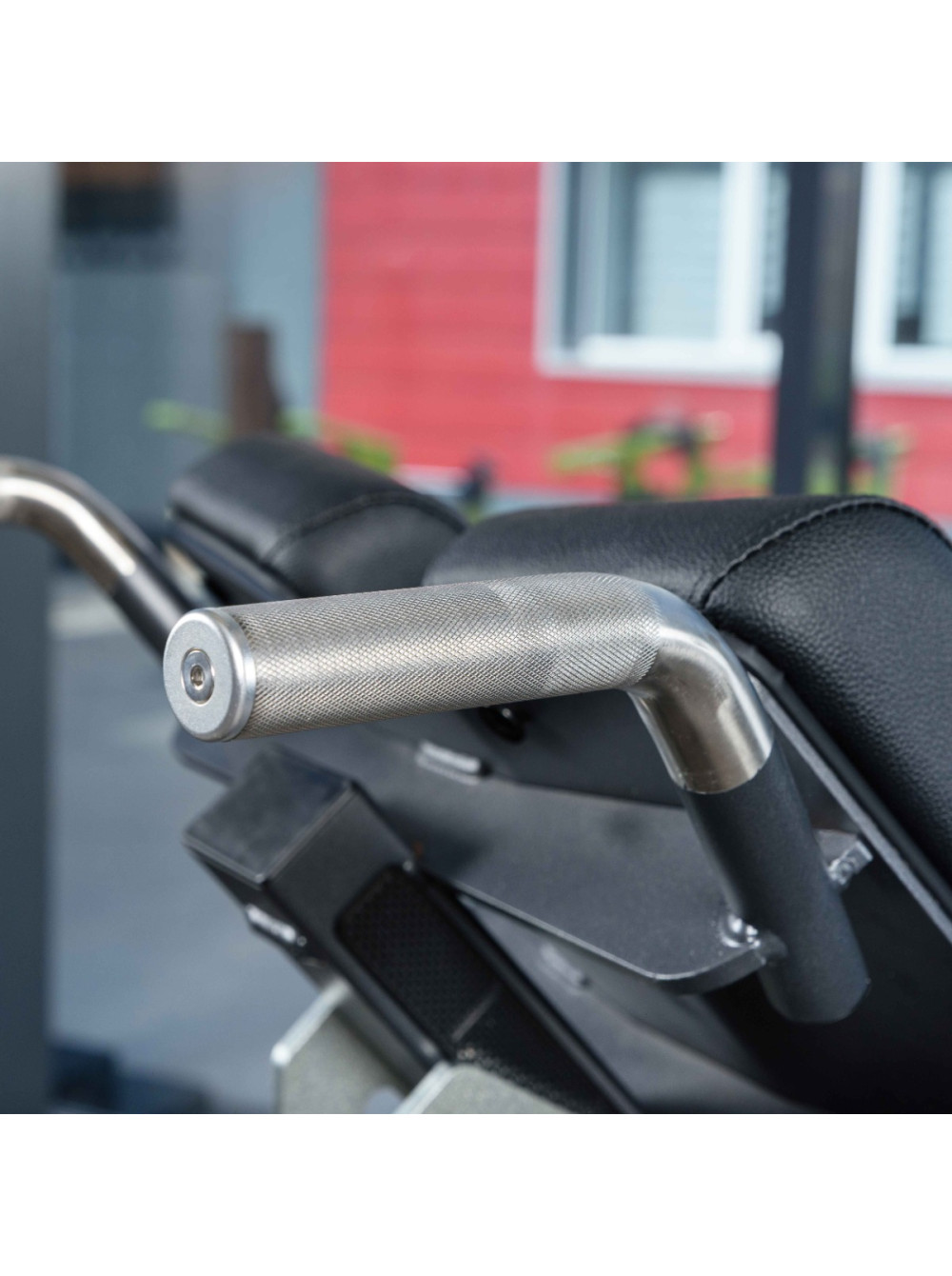 Профессиональный тренажёр для коммерческого использования A627 Гиперэкстензия нагружаемая для проработки мышц задней поверхности бедра, большой ягодичной мышцы и поясничного отдела. Конструкция с подвижным рычагом позволяет выполнять упражнение с регулируемой нагрузкой и точной амплитудой движения без необходимости удерживать дополнительный вес в руках. Основание тренажёра выполнено из стального прямоугольного профиля 80?50 мм с толщиной стенки 3 мм. Все элементы изготавливаются на высокоточном лазерном оборудовании с ЧПУ, что обеспечивает точность геометрии и стабильность конструкции. Несущие узлы соединены методом роботизированной сварки, исключающим перекосы и повышающим эксплуатационную надёжность. На металлические элементы после антикоррозийной обработки нанесено двухслойное порошковое напыление в электростатическом поле для обеспечения прочности покрытия и устойчивости к истиранию. Цветовое исполнение: графит (возможна индивидуальная окраска под проект). Нагрузка: свободные веса. Подвижный рычаг снабжён хромированным накопителем под диски длиной 320 мм и диаметром 45 мм, рассчитанным на диски с посадочным отверстием 50 мм. Торец накопителя закрыт пластиковой заглушкой. На подвижном рычаге и на раме установлены металлические фиксаторы для крепления эспандеров длиной 100 мм. Фиксаторы имеют торцевую упорную пластину, предотвращающую соскальзывание эспандеров и обеспечивающую надёжную фиксацию при динамических нагрузках. Рычаг снабжён двумя рукоятями V-образной формы, положение которых регулируется по дугообразной направляющей в шести фиксированных положениях. Дополнительно рукояти имеют ограниченное свободное движение по полукруглой траектории, что обеспечивает естественную биомеханику при выполнении упражнения. Рабочая зона тренажёра оснащена двумя отдельными подушками для опоры бёдер длиной 340 мм и шириной 190 мм каждая. Расстояние между подушками 85 мм. Подушки имеют скруглённые края для комфорта и равномерного распределения давления. Высота подушек регулируется вручную в шести положениях при помощи механического фиксатора. Начальная высота между верхним краем подушки и наклонной платформой для ног составляет 920 мм, максимальная – 1110 мм. В зоне опоры корпуса установлены две металлические рукояти диаметром 30 мм и длиной 125 мм с ромбовидной накаткой для удобного хвата при регулировке положения подушек и размещении спортсмена. Торцы рукоятей закрыты металлическими заглушками с болтовой фиксацией. Платформы для ног выполнены из листовой стали толщиной 4 мм с противоскользящим рифлением и скруглёнными краями. Конструкция включает две рабочие зоны: – горизонтальную платформу для размещения спортсмена при заходе на тренажёр длиной 300 мм, шириной 365 мм (в крайних точках). – наклонную платформу для упора ног при выполнении упражнения длиной 265 мм, шириной 550 мм (в крайних точках). Платформа имеет постоянный угол наклона, не требующий регулировки. В зоне опоры ног установлены две подушки для фиксации голеней, обеспечивающие устойчивое положение тела во время выполнения упражнения. Размер одной подушки: длина 145 мм, ширина 225 мм. Расстояние между подушками: 100 мм. Все мягкие элементы – подушки для опоры бёдер и фиксации голеней выполнены из вспененного полиуретана, обеспечивающего оптимальную плот