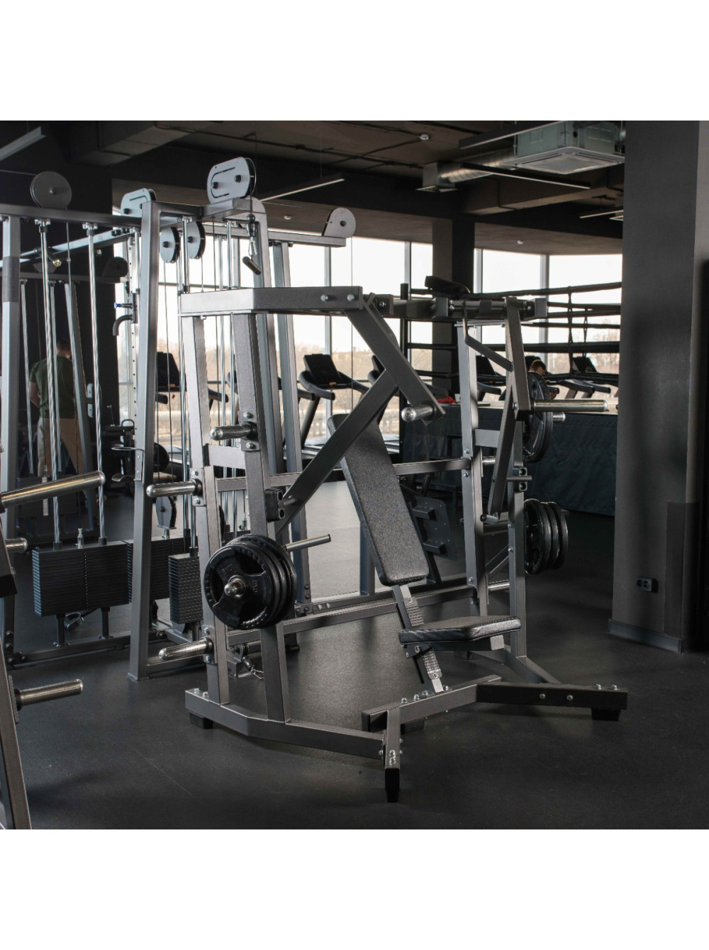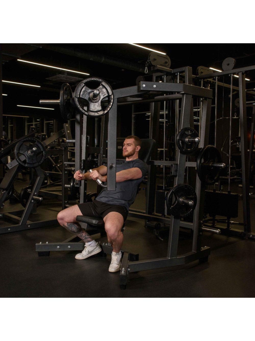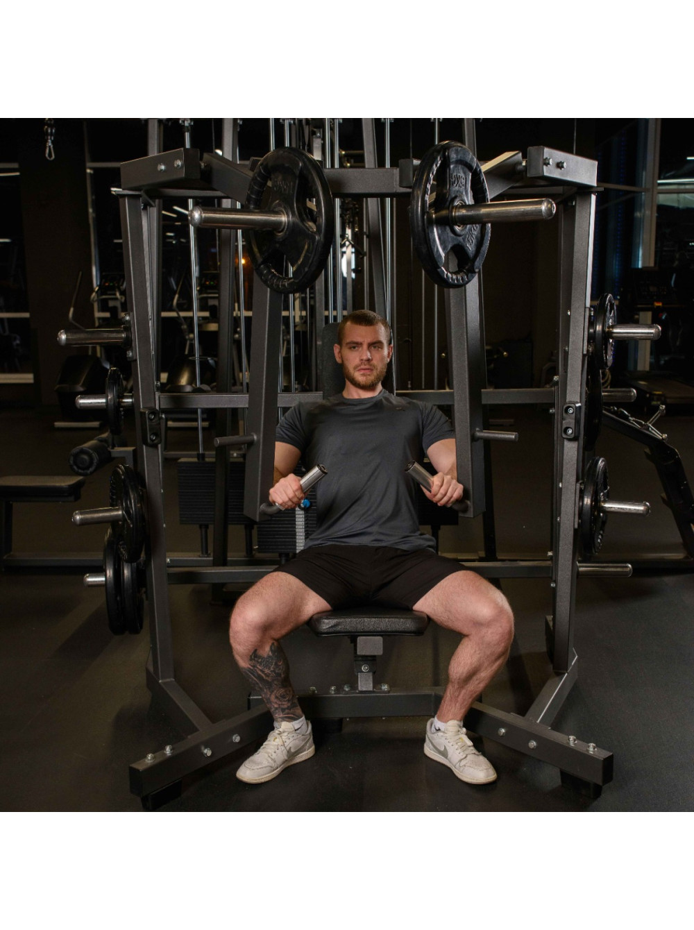 Профессиональный тренажер для коммерческого использования SM2014 Независимый жим от груди широким хватом предназначен для тренировки больших грудных мышц. Основа выполнена из стальной профильной трубы 3?1,5 in (76?38 мм), толщиной 3,18 мм для максимальной структурной прочности. Изготовлено на высокоточном лазерном оборудовании с ЧПУ. Места соединения усилены листами из металла толщиной 12 мм. Рычаги усилены страховочными пластинами из металлического листа толщиной 12 мм. На раме закреплены рубчатые коврики для защиты тренажера от износа и спортсмена от скольжения при выполнении упражнения. Несущие узлы рамы выполнены по технологии роботизированной сварки, что исключает человеческий фактор и повышает эксплуатационные характеристики оборудования. На металлические элементы после антикоррозийной обработки нанесено двухслойное порошковое напыление в электростатическом поле для обеспечения максимального сцепления и структурной прочности. Торцы профиля закрыты пластиковыми заглушками с надежными фиксаторами. Цвет рамы: графит (другие цвета опционально). Тренажер имеет пять опорных ножек из плотной резины, обеспечивающие устойчивое положение и оптимальную высоту для доступа к накопителям для хранения весов. Соприкасающиеся элементы оборудованы резиновыми отбойниками для защиты рамы от механических повреждений и смягчения удара при завершении подхода. Во всех узлах вращения и качения применяются литые чугунные подшипниковые узлы SKF шведского производства. На осях рычагов расположены пластиковые защитные пыльники. Нагрузка: свободные веса. Два хромированных накопителя на подвижных рычагах оборудованы металлическими держателями для фиксации свободных весов. Стартовое сопротивление 0,9 кг на один рычаг. На торцах накопителей установлены заглушки из пластика. Количество хромированных накопителей для хранения свободных весов: шесть накопителей длиной 170 мм из толстостенной стальной трубы диаметром 48 мм. Максимальный вес на накопитель: 100 кг. Накопители для работы с весами и хранения оборудованы кольцами из плотной резины для предотвращения соприкосновения дисков с рамой тренажера. На подвижных рычагах установлены металлические стопоры для мягкого соприкосновения с резиновыми отбойниками. Сиденье и спинка выполнены из вспененного полиуретана, обивка из премиальной искусственной кожи. Рассчитано на длительную интенсивную эксплуатацию с сохранением эстетичного внешнего вида. Ручная регулировка сиденья тренажера возможна в 12 положениях, закрепляется металлическим фиксатором на гибком эластичном шнуре. Цвет обивки: черный (другие цвета опционально). Две рукоятки диаметром 32 мм выполнены из металлического прутка диаметром 25 мм с неопреновым нескользящим и неабсорбирующим влагу покрытием.  На раму тренажера нанесена инструкция для предотвращения травмирования и соблюдения техники выполнения упражнения. Соответствует международным стандартам качества и безопасности, имеет T?V-сертификат. Габариты тренажера в собранном состоянии (Д?Ш?В): 1950?1140?1890 мм. Профиль: 3?1,5 in (76?38 мм), толщина 3,18 мм. Вес: 139 кг. Гарантия: год на фурнитуру и обивку, 5 лет на раму. Производитель: DHZ Fitness. Производитель оставляет за собой право на внесение изменений в конструкцию и комплектацию тренажера, не влияющих на его эксплуатационные качества. Пр