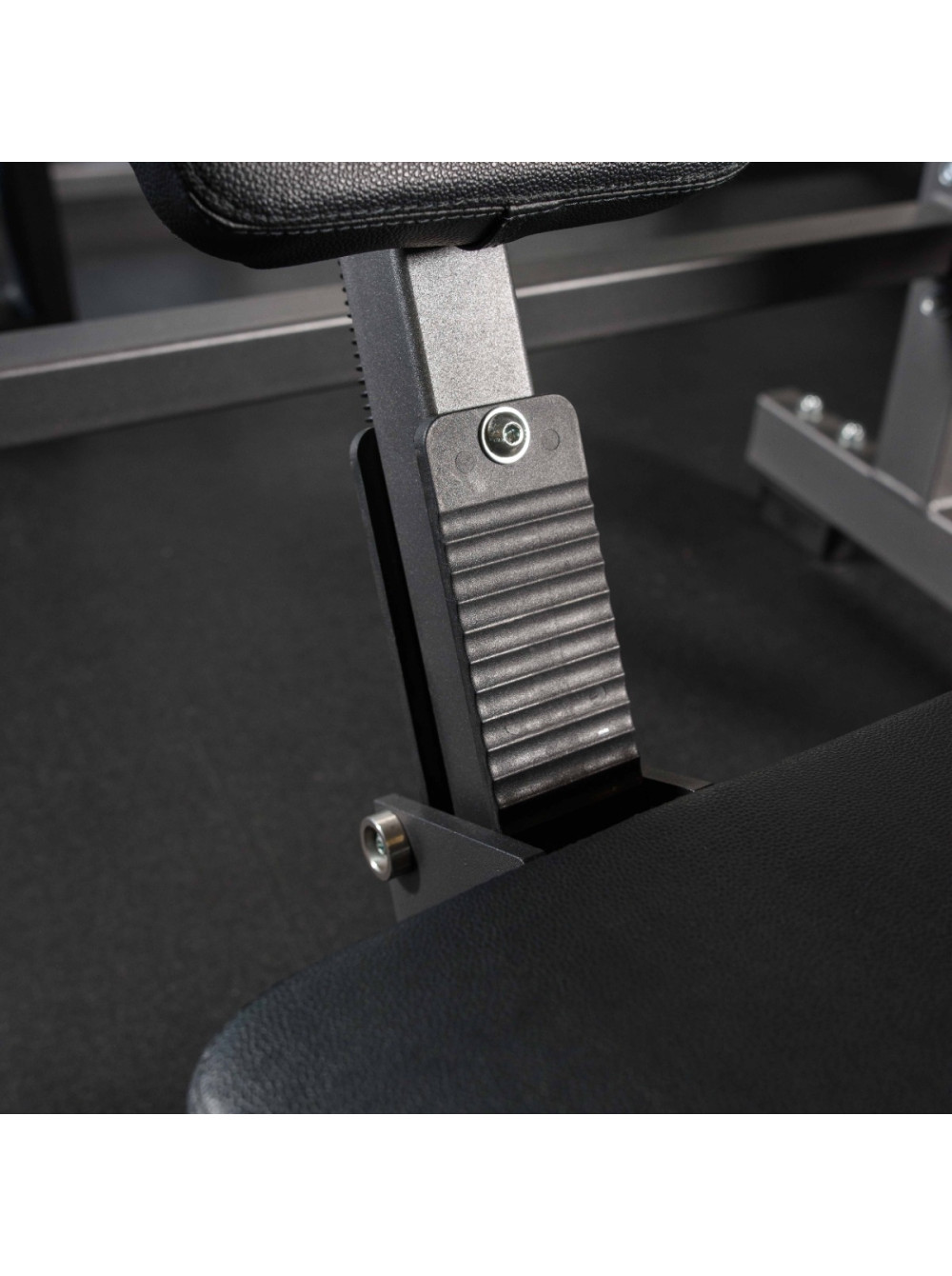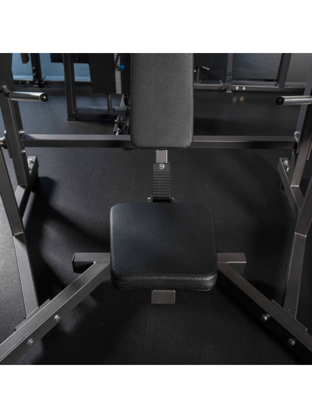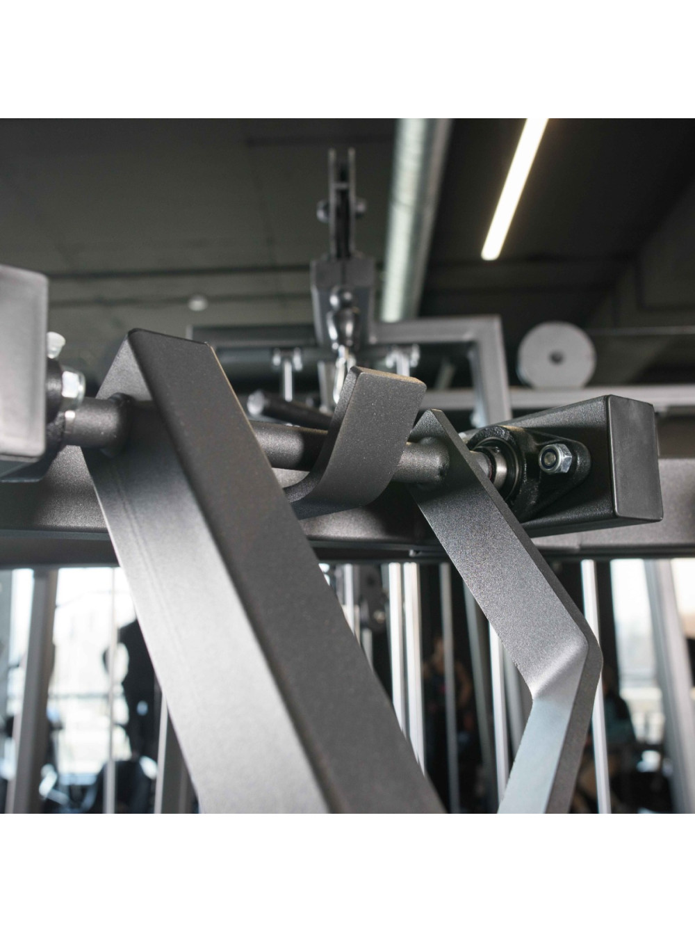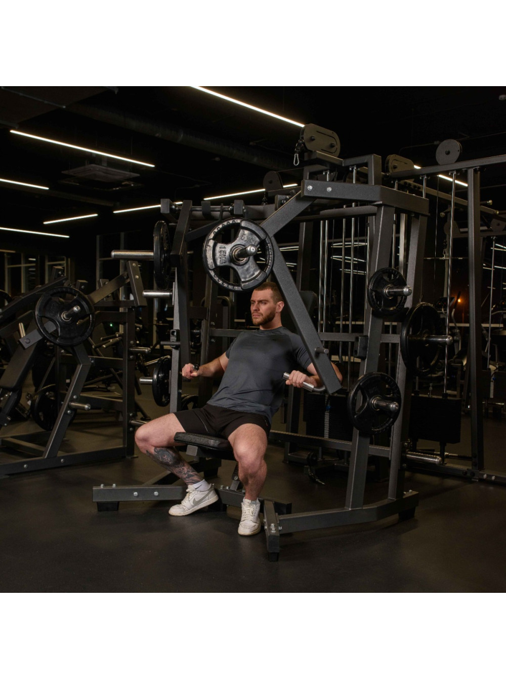 Профессиональный тренажер для коммерческого использования SM2014 Независимый жим от груди широким хватом предназначен для тренировки больших грудных мышц. Основа выполнена из стальной профильной трубы 3?1,5 in (76?38 мм), толщиной 3,18 мм для максимальной структурной прочности. Изготовлено на высокоточном лазерном оборудовании с ЧПУ. Места соединения усилены листами из металла толщиной 12 мм. Рычаги усилены страховочными пластинами из металлического листа толщиной 12 мм. На раме закреплены рубчатые коврики для защиты тренажера от износа и спортсмена от скольжения при выполнении упражнения. Несущие узлы рамы выполнены по технологии роботизированной сварки, что исключает человеческий фактор и повышает эксплуатационные характеристики оборудования. На металлические элементы после антикоррозийной обработки нанесено двухслойное порошковое напыление в электростатическом поле для обеспечения максимального сцепления и структурной прочности. Торцы профиля закрыты пластиковыми заглушками с надежными фиксаторами. Цвет рамы: графит (другие цвета опционально). Тренажер имеет пять опорных ножек из плотной резины, обеспечивающие устойчивое положение и оптимальную высоту для доступа к накопителям для хранения весов. Соприкасающиеся элементы оборудованы резиновыми отбойниками для защиты рамы от механических повреждений и смягчения удара при завершении подхода. Во всех узлах вращения и качения применяются литые чугунные подшипниковые узлы SKF шведского производства. На осях рычагов расположены пластиковые защитные пыльники. Нагрузка: свободные веса. Два хромированных накопителя на подвижных рычагах оборудованы металлическими держателями для фиксации свободных весов. Стартовое сопротивление 0,9 кг на один рычаг. На торцах накопителей установлены заглушки из пластика. Количество хромированных накопителей для хранения свободных весов: шесть накопителей длиной 170 мм из толстостенной стальной трубы диаметром 48 мм. Максимальный вес на накопитель: 100 кг. Накопители для работы с весами и хранения оборудованы кольцами из плотной резины для предотвращения соприкосновения дисков с рамой тренажера. На подвижных рычагах установлены металлические стопоры для мягкого соприкосновения с резиновыми отбойниками. Сиденье и спинка выполнены из вспененного полиуретана, обивка из премиальной искусственной кожи. Рассчитано на длительную интенсивную эксплуатацию с сохранением эстетичного внешнего вида. Ручная регулировка сиденья тренажера возможна в 12 положениях, закрепляется металлическим фиксатором на гибком эластичном шнуре. Цвет обивки: черный (другие цвета опционально). Две рукоятки диаметром 32 мм выполнены из металлического прутка диаметром 25 мм с неопреновым нескользящим и неабсорбирующим влагу покрытием.  На раму тренажера нанесена инструкция для предотвращения травмирования и соблюдения техники выполнения упражнения. Соответствует международным стандартам качества и безопасности, имеет T?V-сертификат. Габариты тренажера в собранном состоянии (Д?Ш?В): 1950?1140?1890 мм. Профиль: 3?1,5 in (76?38 мм), толщина 3,18 мм. Вес: 139 кг. Гарантия: год на фурнитуру и обивку, 5 лет на раму. Производитель: DHZ Fitness. Производитель оставляет за собой право на внесение изменений в конструкцию и комплектацию тренажера, не влияющих на его эксплуатационные качества. Пр