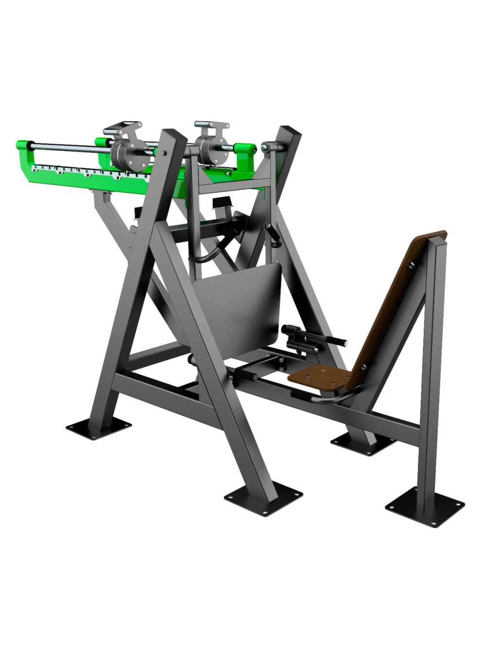 F-2817 Уличный тренажер Жим ногами с переменной нагрузкой ZAVODSPORTA 0 отзывов 351000р. Оптовая цена: 280800р. для покупки по оптовой цене свяжитесь с нами по телефону Производитель: ZSO Наличие: Предзаказ Модель: ef8176a1-b43d-11ee-bab0-00155d019500 Одежда Обувь Как выбрать одежду своего размера? Купить Купить в один клик Скидки постоянным клиентам! Гарантия качества всех товаров магазина! Описание Отзывов (0) Уличный тренажер Жим ногами с переменной нагрузкой ZAVODSPORTA* предназначен для установки на уличных спортивных площадках с учетом интенсивной эксплуатации в разных климатических условиях. Тренажёры серии Force спроектированы по образцу профессионального оборудования для залов, с учётом антропометрических данных пользователей и биомеханики движений, обеспечивая комфортное и физиологичное выполнение упражнений. Несущая конструкция уличного тренажера выполнена из профильных труб 120?80 мм и 100?50 мм с толщиной стенки 3 мм. Детали изготовлены из листового металла толщиной 8 мм и 3 мм. Основание закладной (гильза) выполнено из трубы 80?80?3 мм с цокольной опорой крепления из листового металла толщиной 8 мм и 6 мм. Фланцевое соединение для монтажа тренажера выполнено из листового металла 300?300 мм с толщиной 8 мм, имеет 4 овальных отверстия для регулировки тренажера под болтовое крепление М16. Резьбовые соединения защищены составными металлическими колпачками, входящими в комплект поставки. Подвижные рычаги изготовлены из профильной трубы 100?50 мм с толщиной стенки 3 мм. Детали изготовлены из листового металла толщиной 8 мм, 6 мм, 3 мм. Подвижные рычаги оснащены передвижными грузовыми блоками, изготовленными из листового металла толщиной 8 мм. Перемещение грузовых блоков осуществляется с использованием подшипников при помощи парных рукоятей длиной 120 мм из металлического прутка с мягкой накаткой. Направляющие для перемещения грузовых блоков изготовлены из нержавеющей стальной трубы диаметром 40 мм, что обеспечивает устойчивость к коррозии, высокую износостойкость и стабильность хода подвижных элементов в условиях эксплуатации при темперных перепадах и метеорологических явлениях. Стартовый вес 65 кг с шагом 2,8 кг (на весь рычаг). Плавное ступенчатое увеличение нагрузки доступно в 15 положениях. Общий стартовый вес на два рычага 65 кг, максимальный - 107 кг. Маркировка уровней нагрузки выполнена методом лазерной резки по листовому металлу на оборудовании с ЧПУ, что обеспечивает высокую точность, стойкость и долговечность в условиях уличной эксплуатации. Соприкасающиеся элементы оборудованы резиновыми отбойниками для защиты рамы от механических повреждений и амортизации при завершении подхода. Платформа 740?500 мм выполнена из металлического листа толщиной 3 мм с рифлением. Рукояти для поддержания приложения тела во время выполнения упражнения, рукояти для комфортного размещения на тренажере и рукоять для снятия ограничителей выполнены из стальной трубы диаметром 33 мм с толщиной стенки 3,2 мм. Места хвата оборудованы резиновым покрытием длиной 130 мм с рифлением. Металлические элементы покрыты цинкосодержащим грунтом, формирующим антикоррозийный слой в результате химической реакции компонентов грунта с металлом, и порошковой краской с шагреневой фактурой, запечённой в печи полимеризации. Шагреневое покрытие повышает устойчивость поверхности к механическим повре