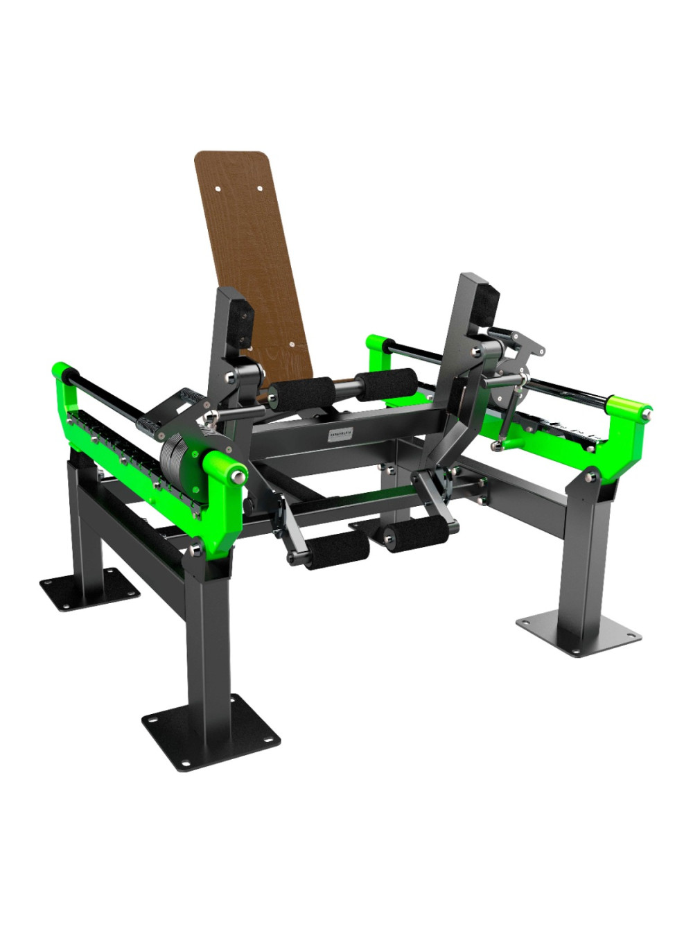 Уличный тренажер Разгибание ног сидя с переменной нагрузкой ZAVODSPORTA* предназначен для установки на уличных спортивных площадках с учетом интенсивной эксплуатации в разных климатических условиях. Тренажёры серии Force спроектированы по образцу профессионального оборудования для залов, с учётом антропометрических данных пользователей и биомеханики движений, обеспечивая комфортное и физиологичное выполнение упражнений. Несущая конструкция уличного тренажера выполнена из профильных труб 120?80 мм и 100?50 мм с толщиной стенки 3 мм. Детали изготовлены из листового металла толщиной 8 мм и 3 мм. Основание закладной (гильза) выполнено из трубы 80?80?3 мм с цокольной опорой крепления из листового металла толщиной 8 мм и 6 мм. Фланцевое соединение для монтажа тренажера выполнено из листового металла 300?300 мм с толщиной 8 мм, имеет 4 овальных отверстия для регулировки тренажера под болтовое крепление М16. Резьбовые соединения защищены составными металлическими колпачками, входящими в комплект поставки. Подвижные рычаги изготовлены из профильной трубы 100?50 мм, 60?60 мм, 60?40 мм с толщиной стенки 3 мм. Детали изготовлены из листового металла толщиной 8 мм, 6 мм, 4 мм, 3 мм. Подвижные рычаги оснащены передвижными грузовыми блоками, изготовленными из листового металла толщиной 8 мм. Перемещение грузовых блоков осуществляется с использованием подшипников при помощи парных рукоятей длиной 120 мм из металлического прутка с мягкой накаткой. Направляющие для перемещения грузовых блоков изготовлены из нержавеющей стальной трубы диаметром 40 мм, что обеспечивает устойчивость к коррозии, высокую износостойкость и стабильность хода подвижных элементов в условиях эксплуатации при темперных перепадах и метеорологических явлениях. Стартовый вес 18 кг с шагом 1,4 кг на один подвижный рычаг. Плавное ступенчатое увеличение нагрузки доступно в 15 положениях. Общий стартовый вес на два рычага 36 кг, максимальный - 78 кг. Подвижные рычаги и торцевая часть сиденья оснащены валиками для комфортного выполнения упражнения. Нерегулируемые валики имеют диаметра 95 мм. Маркировка уровней нагрузки выполнена методом лазерной резки по листовому металлу на оборудовании с ЧПУ, что обеспечивает высокую точность, стойкость и долговечность в условиях уличной эксплуатации. Соприкасающиеся элементы оборудованы резиновыми отбойниками для защиты рамы от механических повреждений и амортизации при завершении подхода. Рукояти для поддержания приложения тела во время выполнения упражнения изготовлены из стальной трубы диаметром 33 мм с толщиной стенки 3,2 мм. Места хвата оборудованы резиновым покрытием длиной 130 мм с рифлением. Рукояти расположены вдоль сиденья. Металлические элементы покрыты цинкосодержащим грунтом, формирующим антикоррозийный слой в результате химической реакции компонентов грунта с металлом, и порошковой краской с шагреневой фактурой, запечённой в печи полимеризации. Шагреневое покрытие повышает устойчивость поверхности к механическим повреждениям и маскирует следы эксплуатации. Поверхности деталей с контактными или ударными зонами дополнительно защищены методом горячего цинкования, обеспечивающим долговременную стойкость к агрессивному воздействию внешней среды. Надёжность и прочность разъёмных соединений конструктивных элементов тренажёра обеспечива