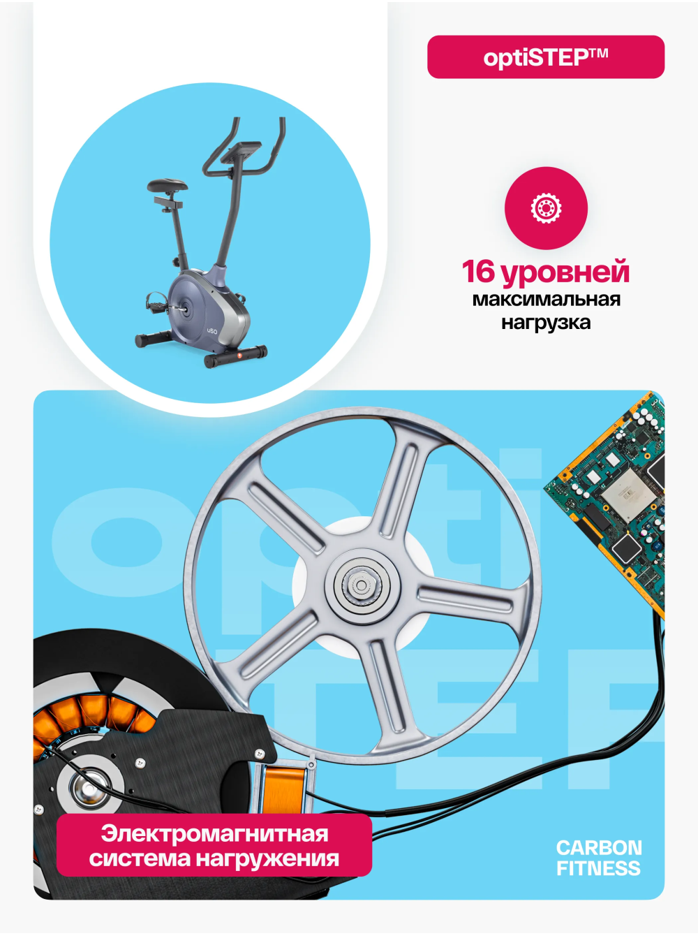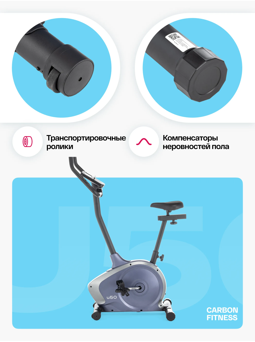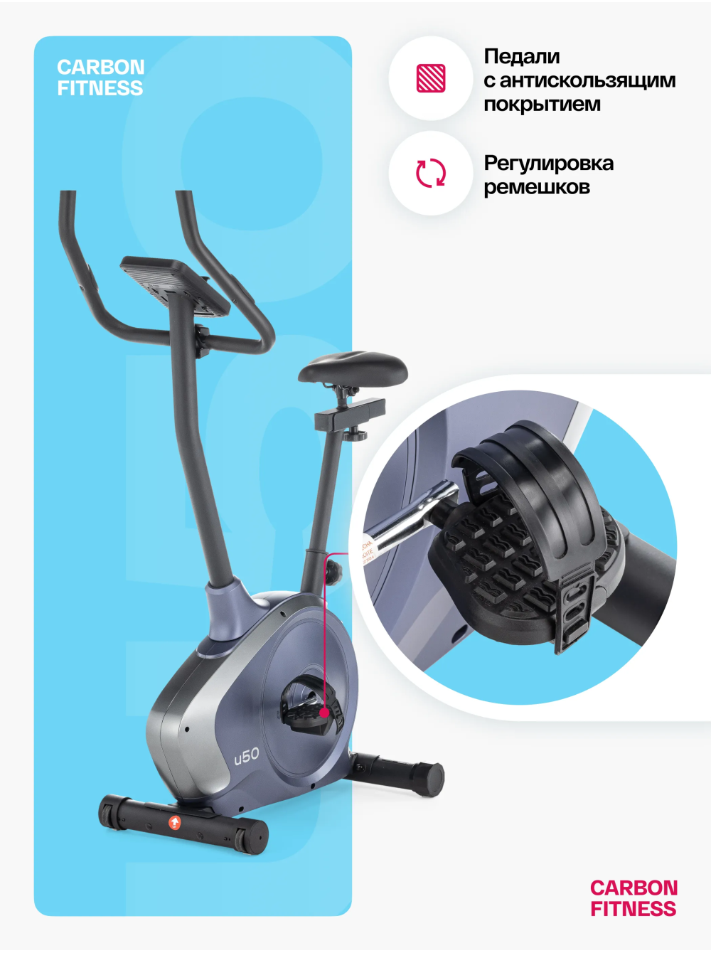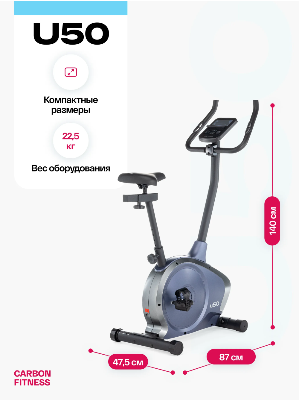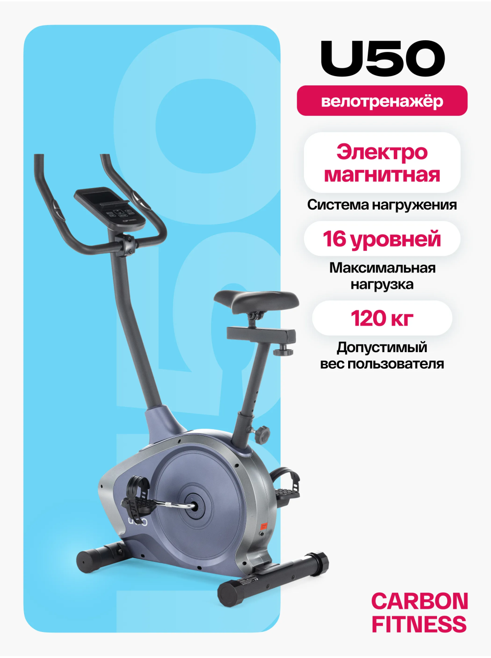 Велотренажер домашний CARBON FITNESS U50 0 отзывов 17990р.20990р. Вы экономите: 3000р. (-14%) Производитель: CARBON Наличие: Есть в наличии Модель: U50 Документы (инструкции): mpdf.php?url=%2Fcatalog%2Fvelotrenazhery%2Fvelotrenazher-domashniy-carbon-fitness-u50%2F&pdfversion=1&name_file=velotrenazher-domashniy-carbon-fitness-u50 Одежда Обувь Как выбрать одежду своего размера? Купить Купить в один клик Скидки постоянным клиентам! Гарантия качества всех товаров магазина! Описание Отзывов (0) Документы Особенности:ЭРГОНОМИЧНЫЙ ДИЗАЙН В НОВЫХ ЦВЕТАХРЕГУЛИРОВКА СИДЕНЬЯ В ДВУХ ПЛОСКОСТЯХМНОГОФУНКЦИОНАЛЬНАЯ LED КОНСОЛЬСЕНСОРНЫЕ ДАТЧИКИ ПУЛЬСАМЯГКОЕ СИДЕНЬЕ АНОТОМИЧЕСКОЙ ФОРМЫ АНТИСКОЛЬЗЯЩИЕ ПЕДАЛИ С РЕМЕШКАМИ ТРАНСПОРТИРОВОЧНЫЕ РОЛИКИ КОМПЕНСАТОРЫ НЕРОВНОСТЕЙ ПОЛА БрендCarbon FitnessАртикулU50Назначение домашнееТип тренажера велотренажер вертикальныйПосадка вертикальная Система нагружения электромагнитнаяКоличество уровней нагрузки16Регулировка нагрузкиэлектроннаяИнерционный вес маховика, кг16, BioFusion™Тип педального узлаоднокомпонентный литой шатунСиденьекомфортабельное, анатомической формыРегулировка положения сиденьяпо горизонтали и вертикалиРукояткистандартный с оплеткой из пенорезиныИзмерение пульсаестьКонсоль LCDТип консоли LCD дисплей с белой индикациейПоказания консоливремя, скорость, дистанция, калории, пульс, нагрузка, программа, обороты в минуту, ВаттыОбщее количество программ22Спецификация программручной режим, 10 предустановленных, жироанализатор, Ватты, 4 пульсозависимые, 4 пользовательские, восстановлениеЯзык интерфейсарусский, английскийПодставка под планшет/смартфонДаТранспортировочные роликиДаКомпенсаторы неровностей полаДаДополнительные функциисенсорные датчики на поручняхВес нетто, кг22.5Вес брутто, кг25Максимальный вес пользователя 120Подключение к сети220 ВПроизводительFitathlon Group (подразделение в Германии)Страна изготовленияКНР Велотренажер домашний CARBON FITNESS U50 с вертикальной посадкой – это идеальный выбор для домашних тренировок. Он подходит как для начинающих, так и для любителей фитнеса, предлагая базовые, но функциональные характеристики, обеспечивающие высокую эффективность занятий. Сиденье анатомической формы с возможностью регулировки в двух плоскостях - по вертикали и горизонтали, а также педали с антискользящим покрытием и регулируемыми ремешками обеспечивают максимальный комфорт и безопасность во время тренировок на велотренажере U50. CARBON FITNESS U50 оснащен электромагнитной системой нагружения optiSTEP™ с 16 уровнями нагрузки, которая позволяет настроить тренировку под индивидуальные потребности и уровень подготовки. Маховик BioFusion с инерционным весом 16 кг гарантирует плавные и устойчивые движения во время тренировок. Этот маховик обеспечивает оптимальную инерцию, что создает естественное и комфортное ощущение езды на велотренажере. Габариты тренажера U50 составляют всего 87*47,5*140 см, что делает его подходящим даже для небольших комнат. Благодаря транспортировочным роликам и компенсаторам неровностей пола, установка и перемещение оборудования становятся простым и удобным процессом. Черный LCD дисплей с яркой белой индикацией и понятным интерфейсом отображает разнообразные показатели тренировки, включая время, скорость, дистанцию, калории, пульс, нагрузку, профиль программы, обороты в минуту и ВАТТы. С 22 программами, включая ручной режим, предустановленные программы, жи