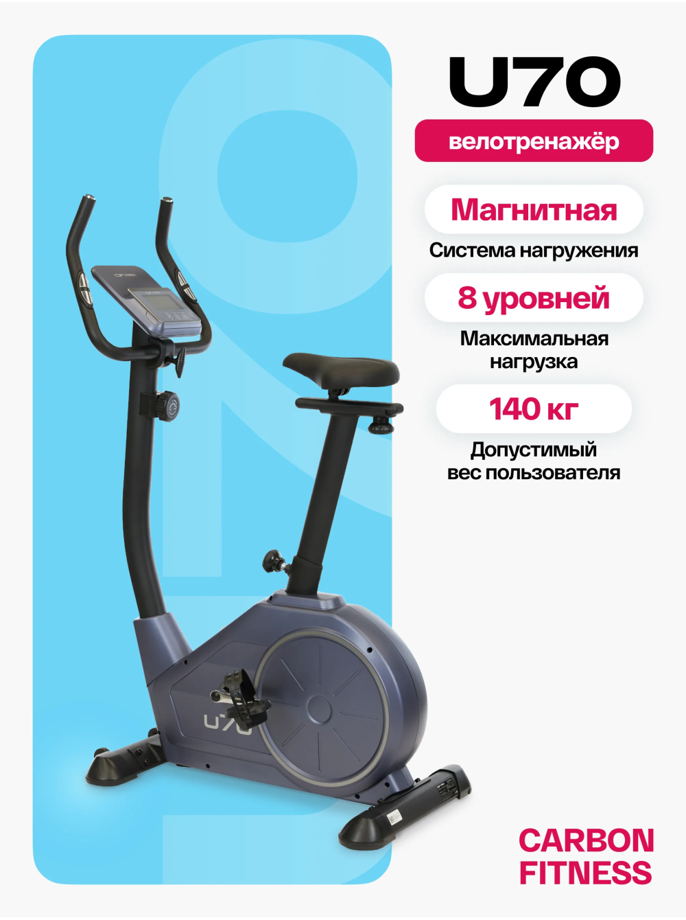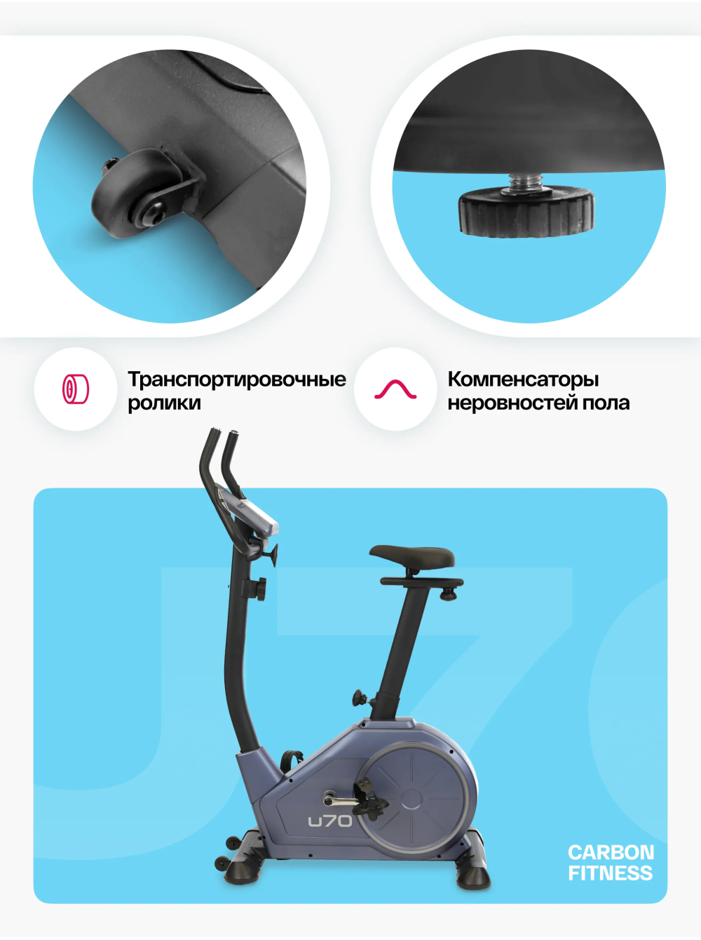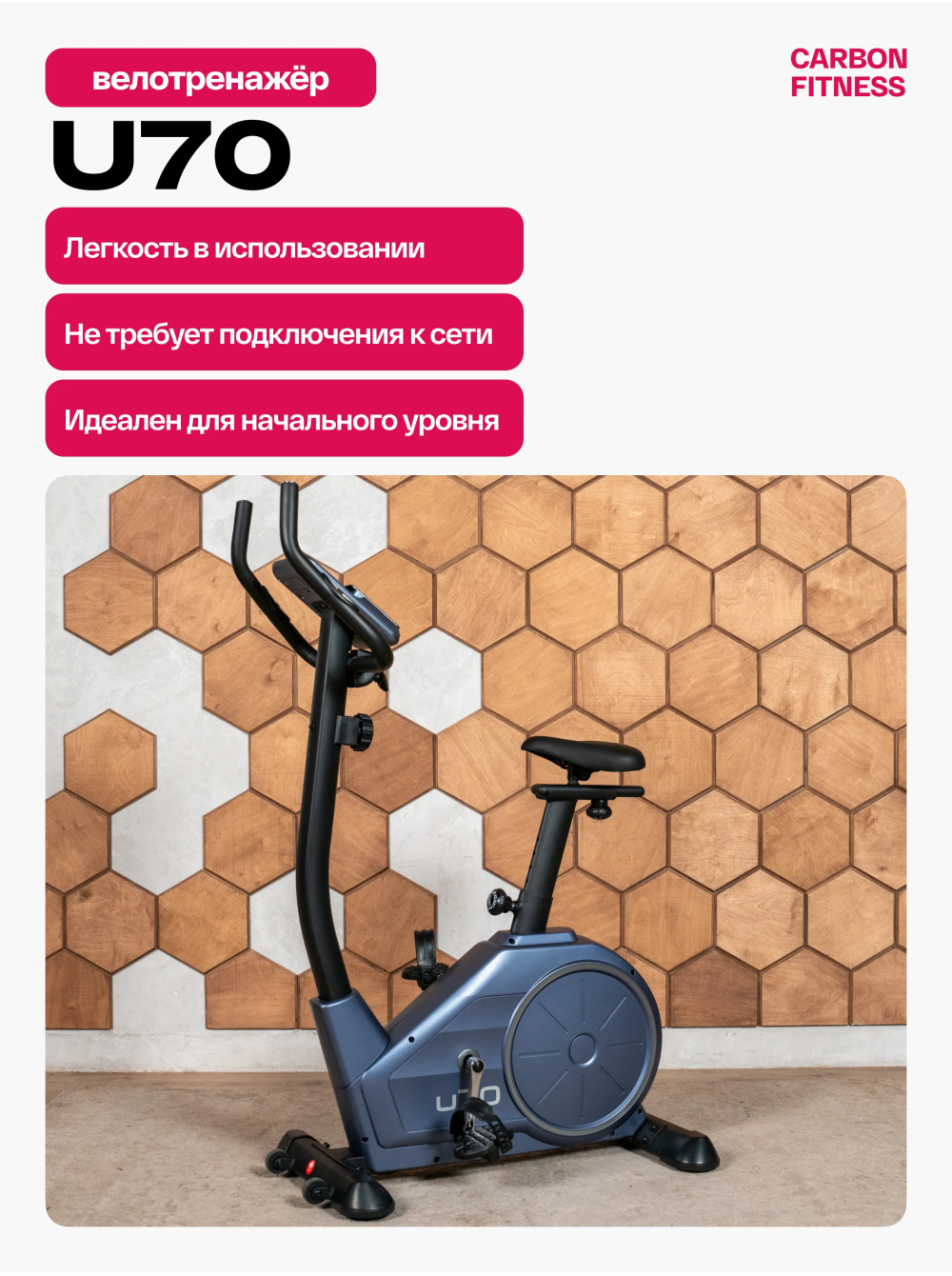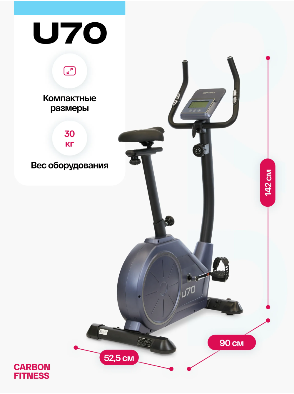 Велотренажер домашний CARBON FITNESS U70 0 отзывов 29990р. Производитель: CARBON Наличие: Есть в наличии Модель: U70 Одежда Обувь Как выбрать одежду своего размера? Купить Купить в один клик Скидки постоянным клиентам! Гарантия качества всех товаров магазина! Описание Отзывов (0) Велотренажер CARBON FITNESS U70 — это идеальный выбор для тех, кто стремится поддерживать форму, не выходя из дома. Высокопрочная рама с антикоррозийной обработкой и механическая магнитная система нагрузки делают его надёжным и долговечным, обеспечивая комфортную и плавную работу на всех 8 уровнях сопротивления. С маховиком BioFusion™ весом 18 кг и задним приводом тренажер обеспечивает устойчивое движение, снижая нагрузку на суставы и повышая эффективность тренировок. Комфортабельное сиденье анатомической формы регулируется как по горизонтали, так и по вертикали, что позволяет настроить его под индивидуальные параметры пользователя, обеспечивая удобную посадку. Сенсорные датчики на поручнях позволяют контролировать пульс, что важно для поддержания нужного уровня нагрузки в зависимости от целей тренировки. LCD-дисплей консоли на русском и английском языках отображает основные параметры тренировки время, скорость, дистанцию, количество оборотов и пульс. Функция одометра и подставка для планшета или смартфона позволяют отслеживать прогресс и оставаться на связи и смотреть любимые видео. CARBON FITNESS U70 поддерживает пользователей до 140 кг, что делает его доступным для всех членов семьи. Прорезиненные педали с регулируемыми ремешками обеспечивают дополнительную безопасность, а транспортировочные ролики позволяют легко перемещать тренажер по дому. Этот компактный велотренажер — надежный выбор для домашних тренировок, обеспечивающий полный контроль над нагрузкой и комфортное использование для достижения спортивных целей. Ключевые преимущества CARBON FITNESS U70: • магнитная система нагружения с 8 уровнями нагрузки; • маховик BioFusion с инерционным весом 18 кг; • максимальный вес пользователя до 140 кг; • компактные габариты: 90*52,5*142 см. Бренд Carbon Fitness Артикул U70 Назначение домашнее Тип тренажера велотренажер вертикальный, Посадка вертикальная Система нагружения магнитная Количество уровней нагрузки 8 Регулировка нагрузки механическая Инерционный вес маховика, кг 18, BioFusion™ Тип педального узла трехкомпонентный шатун Сиденье комфортабельное, анатомической формы Регулировка положения сиденья по горизонтали и вертикали Рукоятки стандартные с оплеткой из пенорезины Измерение пульса есть Консоль LCD Тип консоли LCD дисплей монохромный Показания консоли время, скорость, дистанция, калории, пульс, обороты в минуту, одометр Общее количество программ ручной режим Спецификация программ быстрый старт, ручной режим Язык интерфейса русский, английский Подставка под планшет/смартфон Да Транспортировочные ролики Да Компенсаторы неровностей пола Да Дополнительные функции сенсорные датчики на поручнях Вес нетто, кг 30 Вес брутто, кг 33 Максимальный вес пользователя 140 Подключение к сети не требует подключения, Производитель Fitathlon Group (подразделение в Германии) Страна изготовления КНР Гарантийный срок мес. ? 12 мес. Размеры: Размер в рабочем состоянии, см. 91х52.5x141 Размеры упаковки, см. 97.5х63x25.5 Написать отзыв Ваше имя: Ваш отзыв: Примечание: HTML разметка не поддерживается! Используйте обычный текст. Оцен
