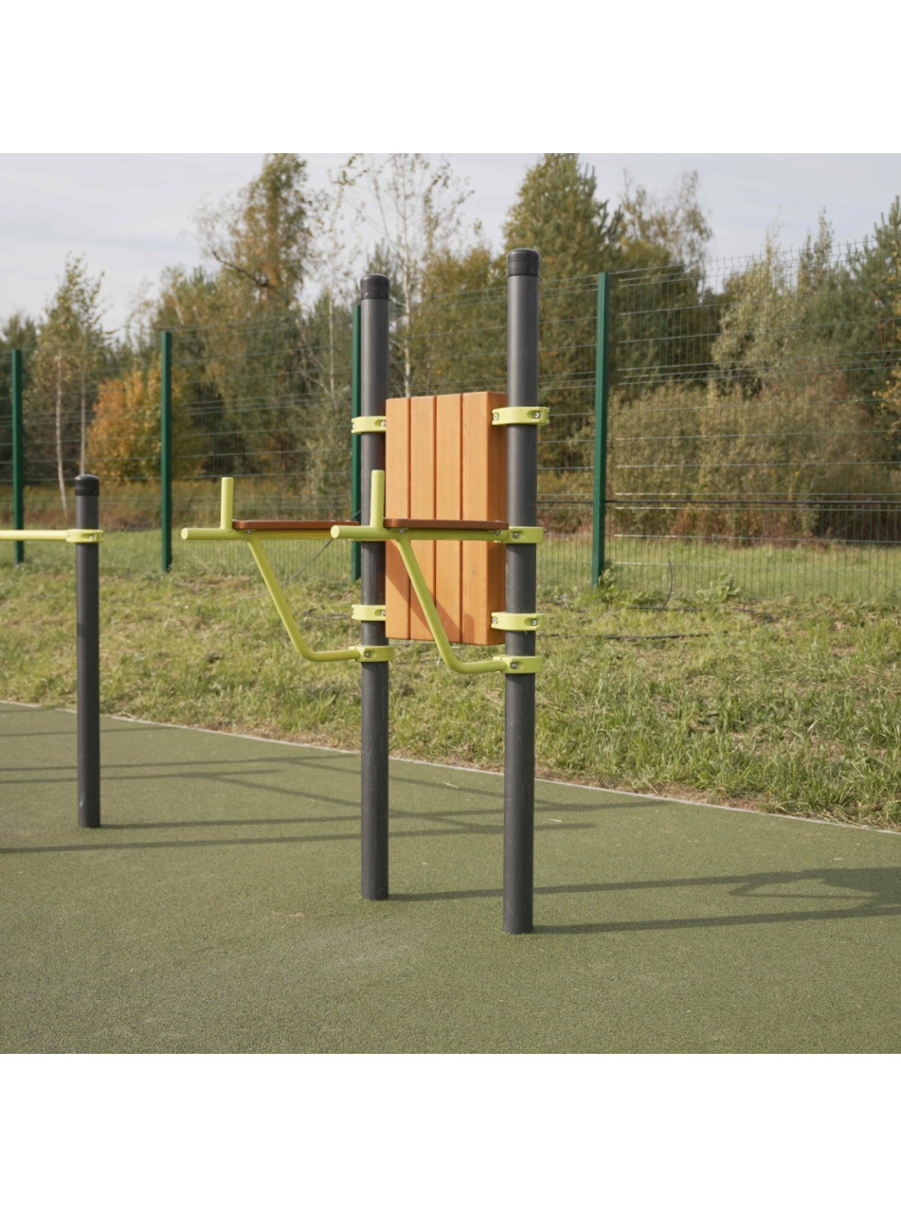 W240 GTO Комплекс для тренировки мышц верхнего плечевого пояса и мышц брюшного пресса ZAVODSPORTA 0 отзывов 62616р. Оптовая цена: 50093р. для покупки по оптовой цене свяжитесь с нами по телефону Производитель: ZSO Наличие: Предзаказ Модель: 663dc785-44c2-11eb-945e-00155d686700 Одежда Обувь Как выбрать одежду своего размера? Купить Купить в один клик Скидки постоянным клиентам! Гарантия качества всех товаров магазина! Описание Отзывов (0) Уличный комплекс для тренировки мышц верхнего плечевого пояса и мышц брюшного пресса ZAVODSPORTA* предназначен для установки на уличных спортивных площадках с учетом интенсивной эксплуатации в разных климатических условиях. Опорные столбы выполнены из металлической трубы диаметром 89 мм с толщиной стенки 3 мм. В состав комплекса входят два опорных столба высотой 3000 мм. Торцы опорных столбов оборудованы пластиковыми заглушками. Спинка 750?415?100 мм выполнена из древесины хвойных пород, предварительно высушенной до нормативной влажности и покрытой износостойким лаком. Такое покрытие формирует прочную защитную плёнку, устойчивую к ультрафиолетовому излучению, влаге и перепадам температур, что продлевает срок службы древесины при круглогодичной эксплуатации на открытом воздухе. Подлокотники с основой из металлической трубы диаметром 34 мм с толщиной стенки 3,2 мм выполнены из влагостойкой фанеры толщиной 24 мм. Спинка и подлокотники фиксируются к опорным столбам с помощью надёжных металлических хомутов с болтовым соединением. Конструкция хомутов обеспечивает прочную посадку и равномерное распределение нагрузки, а самоконтрящиеся гайки М10 предотвращают самопроизвольное ослабление креплений в процессе эксплуатации. Металлические элементы покрыты цинкосодержащим грунтом, формирующим антикоррозийный слой в результате химической реакции компонентов грунта с металлом, а затем — порошковой краской, запечённой в печи полимеризации. Металлические элементы ударопрочны, высокоустойчивы к температурным перепадам и метеорологическим явлениям. Надёжность и прочность разъёмных соединений конструктивных элементов тренажёра обеспечиваются за счёт использования высококачественного оцинкованного крепежа. При изготовлении деталей на высокоточных станках лазерной резки используется технология шип-паз. Это создает точные линейные размеры, точность позиционирования деталей в сборочных узлах и стабильность размеров конструкции тренажера. Цвет опорных столбов: графит (другие цвета опционально). Цвет элементов: pantone 382C (другие цвета опционально). Габариты: 841?755?2030 мм. Вес: 72 кг. Производитель: ZAVODSPORTA. Производитель оставляет за собой право (без предварительного уведомления) на внесение изменений в конструкцию, комплектацию или технологию изготовления тренажера для улучшения эксплуатационных качеств. Оборудование монтируется путем бетонирования опорного столба на глубину 1000 мм и отсыпается песчано-гравийной смесью до уровня площадки (не менее 200 мм). Монтажные схемы прилагаются к комплекту поставки. ?*ZAVODSPORTA — российский производитель коммерческого спортивного оборудования, соответствующего требованиям государственных и муниципальных закупок. Продукция завода отвечает стандартам, предусмотренным федеральными законами № 44-ФЗ и № 223-ФЗ, что позволяет успешно участвовать в тендерных процедурах и поставлять оборудование для б