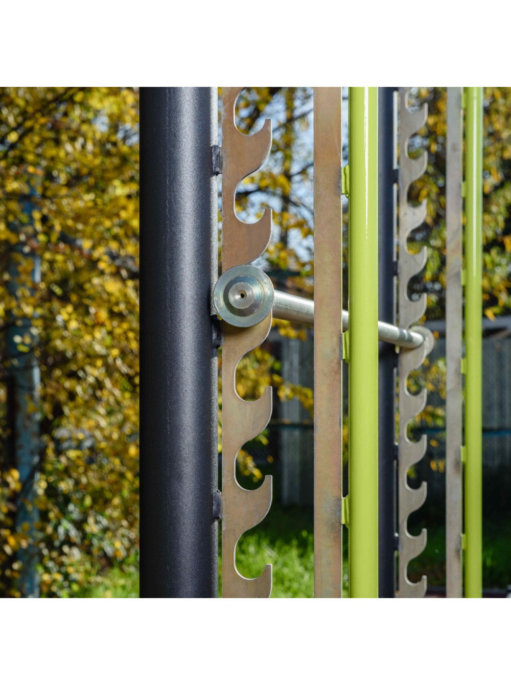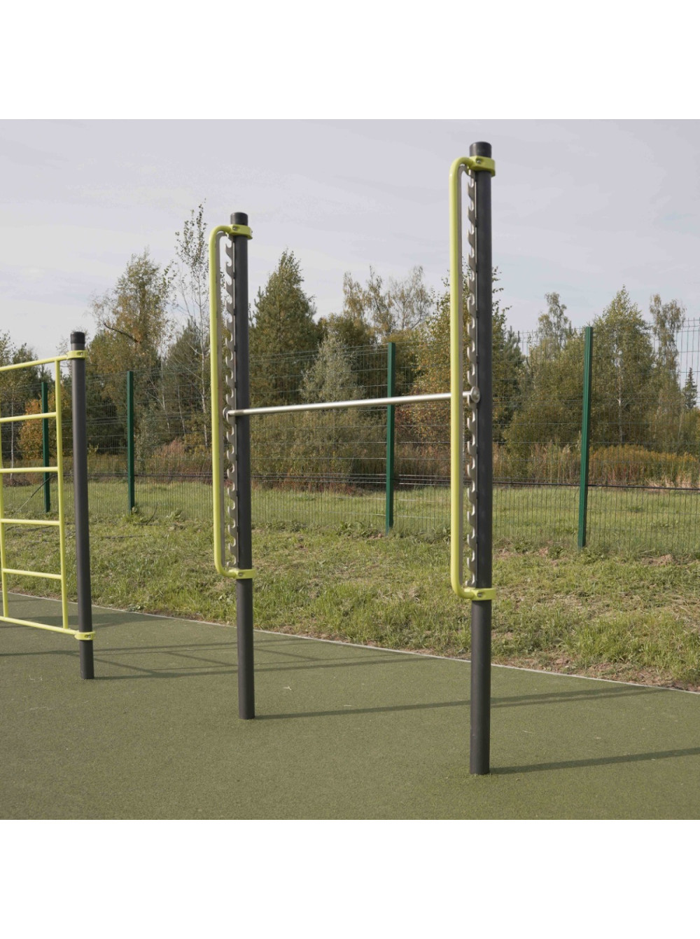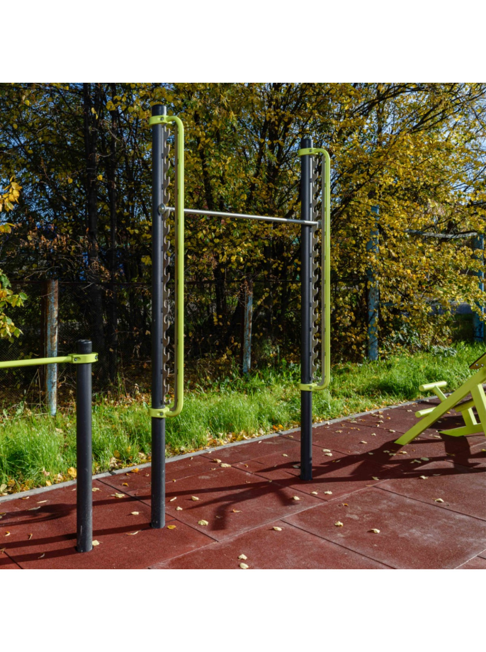 Уличный Турник-перекладина с регулируемой высотой (подходит людям с ограниченными возможностями здоровья) ZAVODSPORTA* предназначен для установки на уличных спортивных площадках с учетом интенсивной эксплуатации в разных климатических условиях. Опорные столбы выполнены из металлической трубы диаметром 89 мм с толщиной стенки 3 мм. В состав комплекса входит два опорных столба с гребенкой для регулируемой перекладины высотой 3750 мм. Торцы опорных столбов оборудованы пластиковыми заглушками. Вертикальные ограничители и турник-перекладина выполнены из металлической трубы диаметром 34 мм с толщиной стенки 3,2 мм. На внутренней стороне ограничителей и опорных столбов приварены пластины и пластины с гребенкой из листовой стали 8 мм. Торцы турника-перекладины оборудованы фиксаторами. Высота турника-перекладины регулируется от 900 мм до 2600 мм (от уровня площадки) с шагом 100 мм. Вертикальные ограничители фиксируются к опорным столбам с помощью надёжных металлических хомутов с болтовым соединением. Конструкция хомутов обеспечивает прочную посадку и равномерное распределение нагрузки, а самоконтрящиеся гайки М10 предотвращают самопроизвольное ослабление креплений в процессе эксплуатации. Упор для ног изготовлен из рифлёного листового металла толщиной 3 мм, по периметру усилен рамкой из профильной трубы 25?25 мм. Конструкция устойчива к деформациям и предотвращает скольжение обуви во время упражнений. Монтажный размер упора: 636?436 мм по осям закладных штифтов, выполненных из прутка диаметром 14 мм. Габариты упора: 700?500?25 мм. Металлические элементы покрыты цинкосодержащим грунтом, формирующим антикоррозийный слой в результате химической реакции компонентов грунта с металлом, а затем — порошковой краской, запечённой в печи полимеризации. Металлические элементы ударопрочны, высокоустойчивы к температурным перепадам и метеорологическим явлениям. Надёжность и прочность разъёмных соединений конструктивных элементов тренажёра обеспечиваются за счёт использования высококачественного оцинкованного крепежа. При изготовлении деталей на высокоточных станках лазерной резки используется технология шип-паз. Это создает точные линейные размеры, точность позиционирования деталей в сборочных узлах и стабильность размеров конструкции тренажера. Цвет опорных столбов: графит (другие цвета опционально). Цвет элементов: pantone 382C (другие цвета опционально). Габариты: 1630?310?2780 мм. Вес: 81 кг. Производитель: ZAVODSPORTA. Производитель оставляет за собой право (без предварительного уведомления) на внесение изменений в конструкцию, комплектацию или технологию изготовления тренажера для улучшения эксплуатационных качеств. Оборудование монтируется путем бетонирования опорного столба на глубину 1000 мм и отсыпается песчано-гравийной смесью до уровня площадки (не менее 200 мм). Монтажные схемы прилагаются к комплекту поставки. ?*ZAVODSPORTA — российский производитель коммерческого спортивного оборудования, соответствующего требованиям государственных и муниципальных закупок. Продукция завода отвечает стандартам, предусмотренным федеральными законами № 44-ФЗ и № 223-ФЗ, что позволяет успешно участвовать в тендерных процедурах и поставлять оборудование для бюджетных учреждений. Изделие внесено в Реестр российской промышленной продукции (Постановление Правител